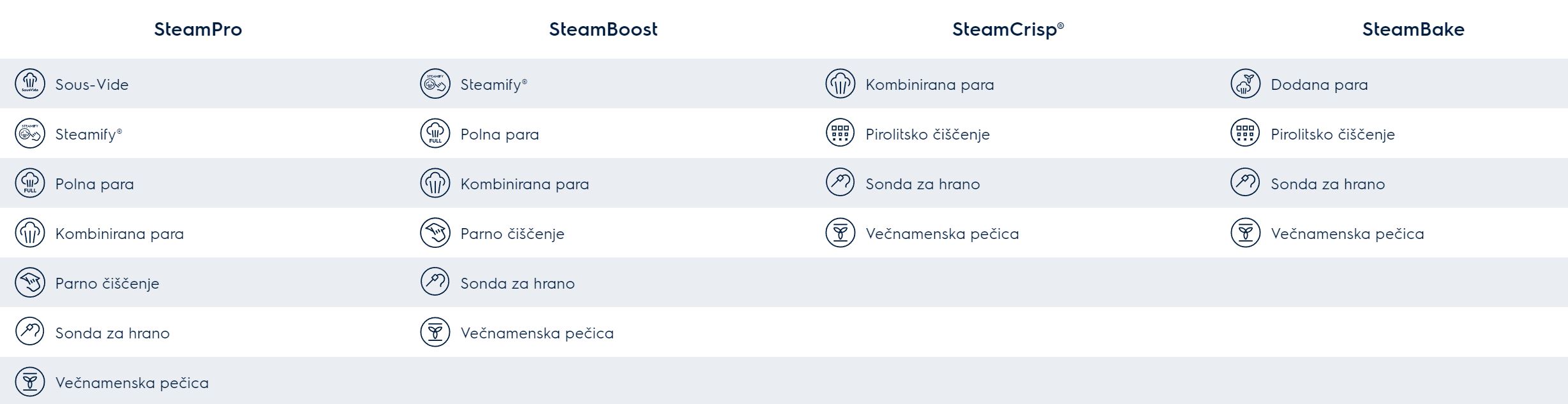 Parna pečica serije SteamPro je glede na raven pare sposobna do popolnosti pripraviti več različnih tipov hrane. Kot že omenjeno zgoraj pri pečicah serije SteamBoost, obstajajo pri teh parnih pečicah štiri ravni pare, s pomočjo katerih si lahko pomagate do popolnih jedi, ne glede na to, kaj pečete ali kuhate. Te pečice so primerne za pripravo vseh vrst jedi, od buhtljev, pic, rulad, piškotov, riža, rib, testenin ali zelenjave.