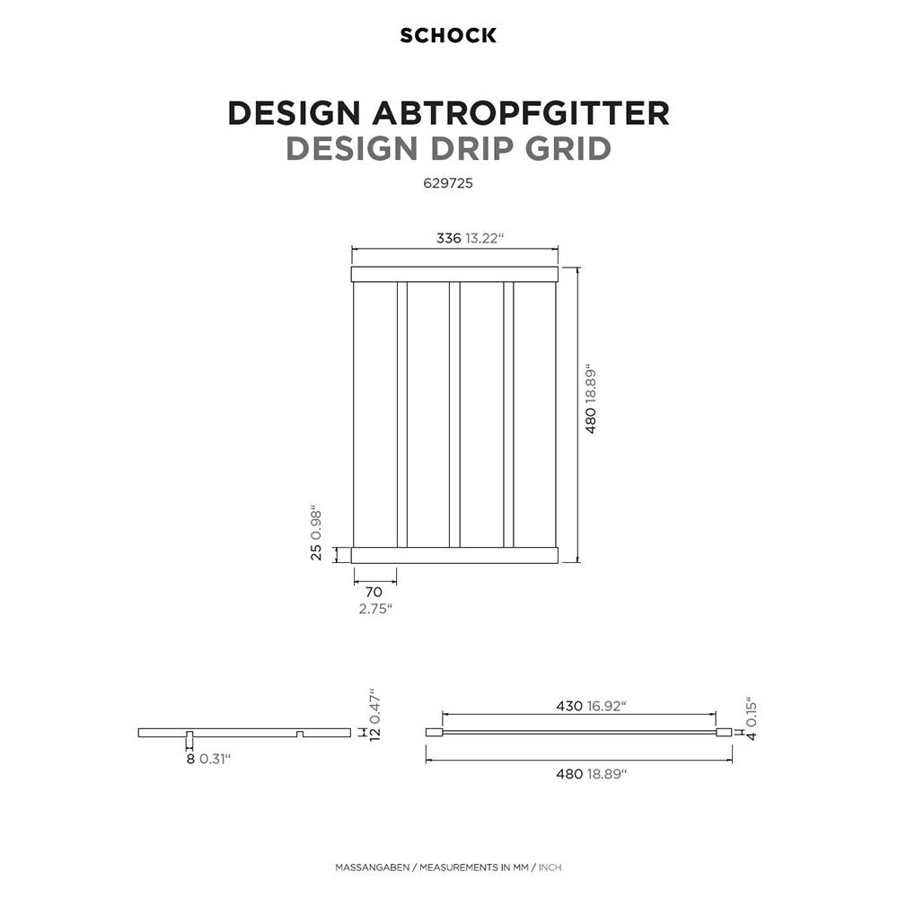 Odcejalnik Schock 629725S je dizajnerski odcejalnik za pomivalna korita Schock. Narejen je iz aluminija v stilu brušenega plemenitega jekla. Odcejalnik je možno dobiti tudi v srebrni (629725EDM) in bakreni barvi (629725COP), vsi trije pa se fantastično podajo mnogim pomivalnim koritom SCHOCK (seznam kompatibilnih korit med tehničnimi podatki). Je odličen dodatek predvsem pomivalnim koritom brez odcejalnega dela, lahko pa ga uporabite tudi kot podaljšan odcejalnik vašemu koritu, če ta že ima odcejalni del.