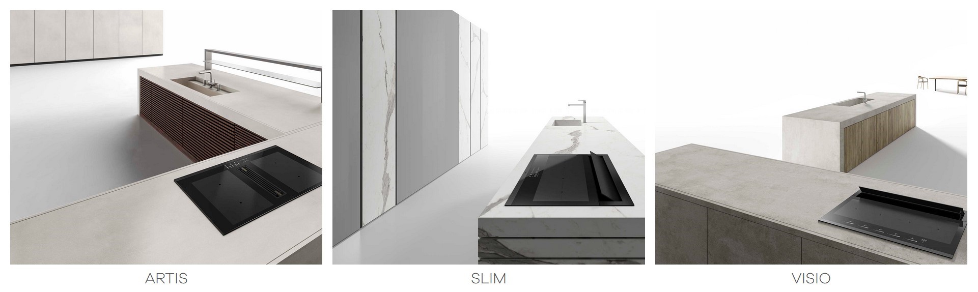 Sistem vključuje 3 linije indukcijskih kuhalnih plošč z integrirano napo: ARTIS, SLIM ter VISIO.