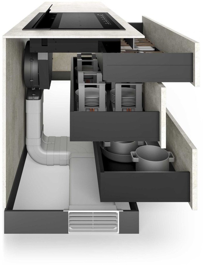 Motor namreč ni nameščen horizontalno direktno pod ploščo kot ga imajo ostale plošče, ampak je nameščen vertikalno ob steni. Takšna namestitev motorja omogoča boljši izkoristek predalov pod ploščo. Kuhališča so razporejena horizontalno eno zraven drugega, napa je nameščena na zadnji strani plošče, da omogoča enakomerno sesanje pare in vonjav za vsa kuhališča. Plošča je na voljo samo v širini 90 cm.