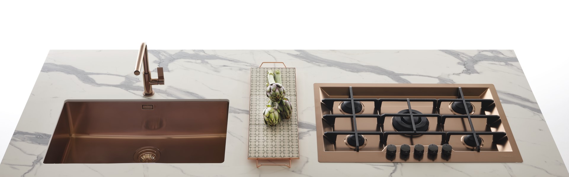 Bakrena barva daje nerjavečemu jeklu topel in retro slog, s čimer pridobi očarljivo in značilno osebnost. Ta obdelava je prisotna na Foster pomivalnih koritih, kuhinjskih armaturah in kuhalnih ploščah iz nerjavečega jekla.
