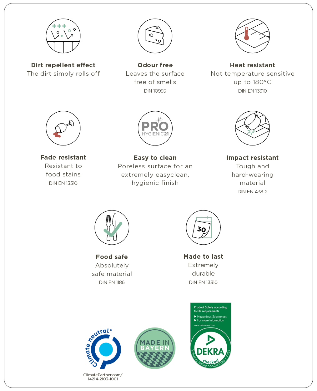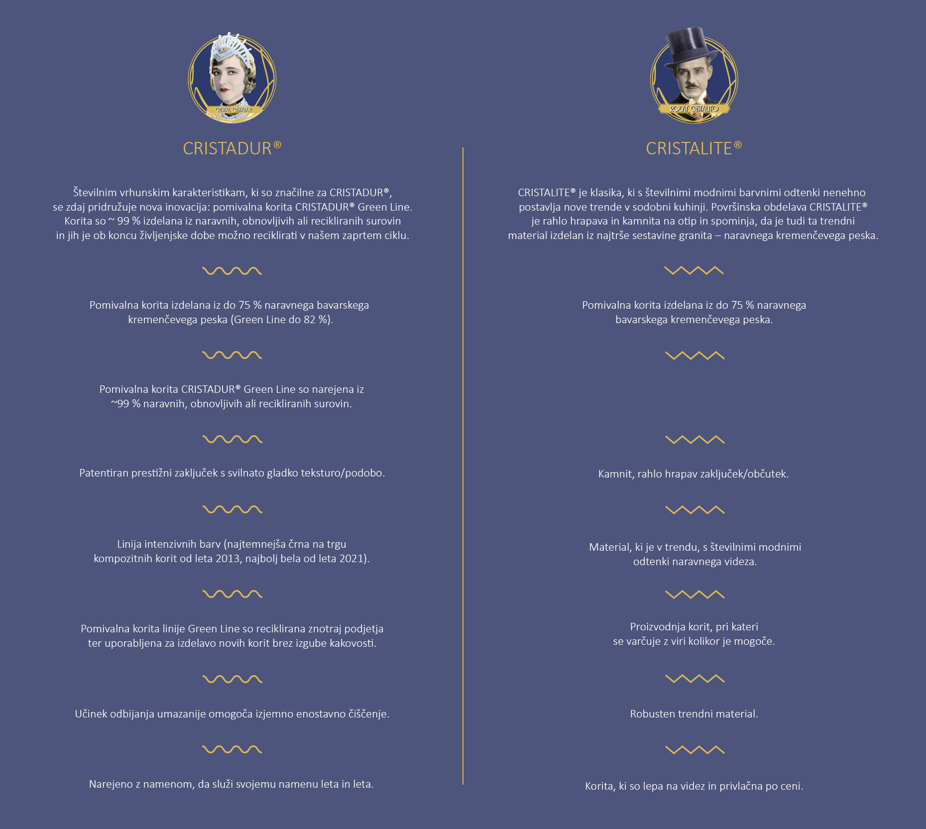 Vsa pomivalna korita te znamke so zgrajena iz naravnega kremenčevega peska, delijo se pa na liniji CRISTALITE® in CRISTADUR®,