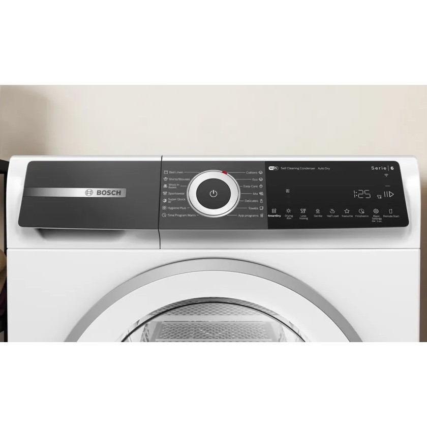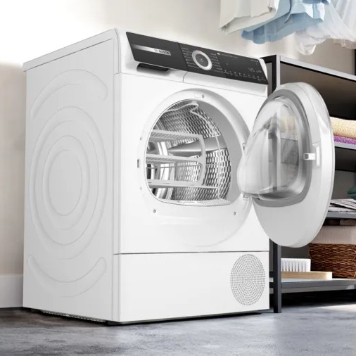 Sušilni stroj s toplotno črpalko Bosch WQH245B2BY serije 6. Samočistilni kondenzator ohranja energetsko učinkovitost vašega stroja z odstranjevanjem vlaken in ostankov niti iz sistema ter z zbiranjem smeti v lahko dostopnem filtru, kar zmanjšuje potrebo po rutinskem čiščenju. AutoDry bo posušil do devet kilogramov perila do želene stopnje suhosti, ne glede na to, ali želite dovolj suho za likanje ali ekstra suho in pripravljeno za organiziranje. Inovativne stranske stene AntiVibration so zasnovane tako, da zagotavljajo večjo stabilnost in optimalno blažijo tresljaje.
