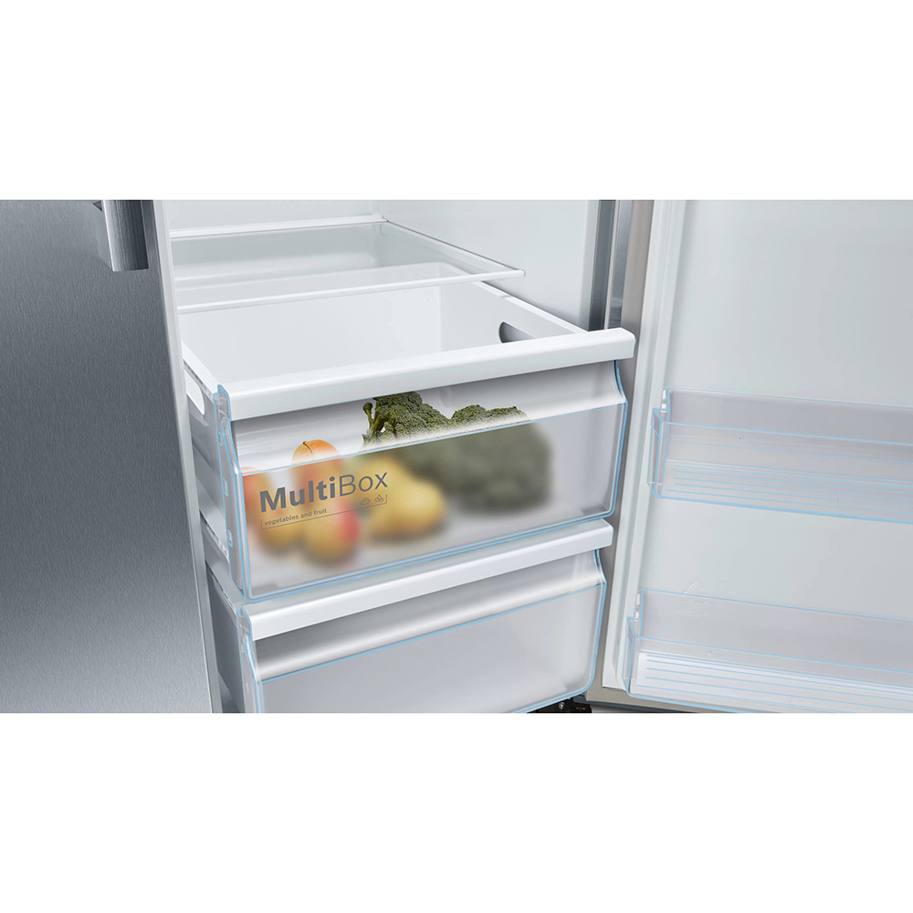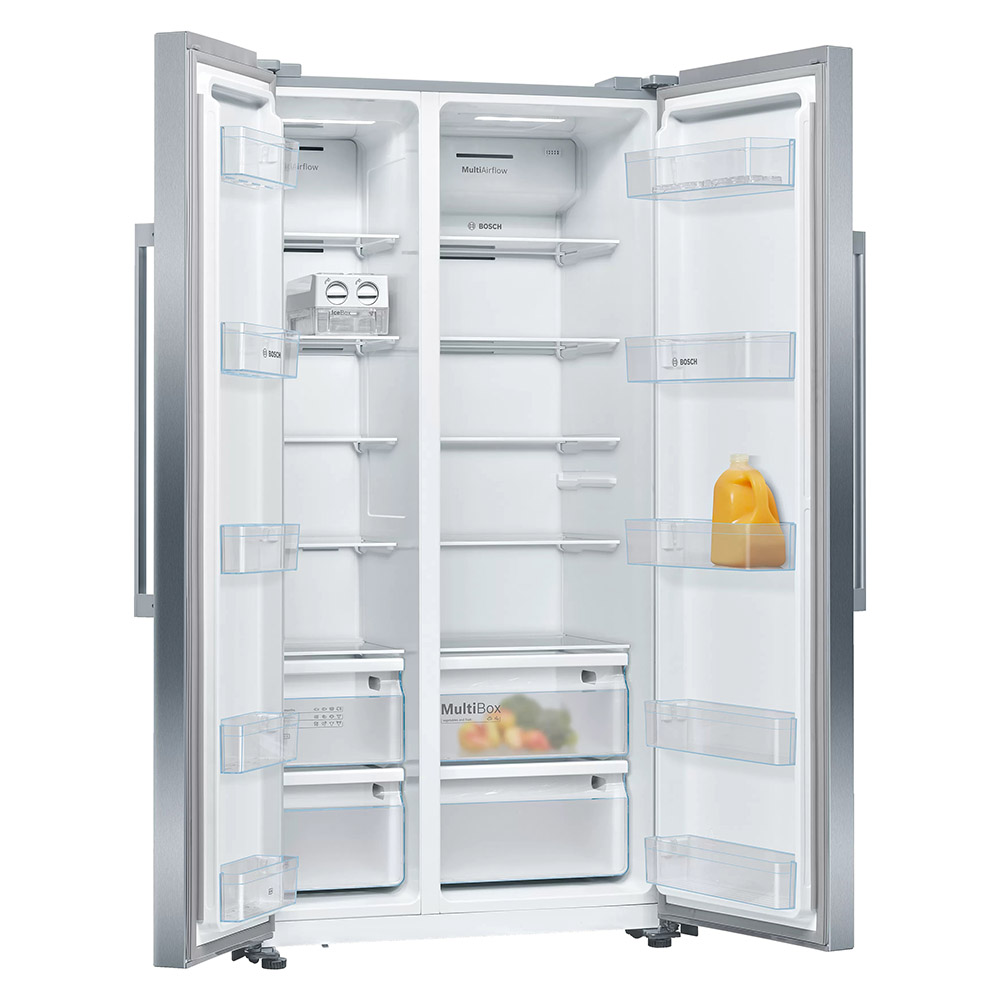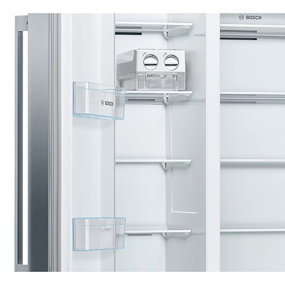Ameriški hladilnik Bosch KAN93VIFP. Če želite ustvariti več lahko preprosto odstranite vse varnostne steklene rešetke iz zamrzovalnega prostora. Ko je aktivirana funkcija Holiday Mode, je temperatura hladilnega dela približno +14°C, temperatura zamrzovalnega dela pa približno -18°C, kar ščiti zamrznjeno hrano in preprečuje potrato energije. Vaše ohlajene pijače pa bodo še boljšega okusa s svežimi ledenimi kockami iz praktičnega, odstranljivega predala IceTwister.