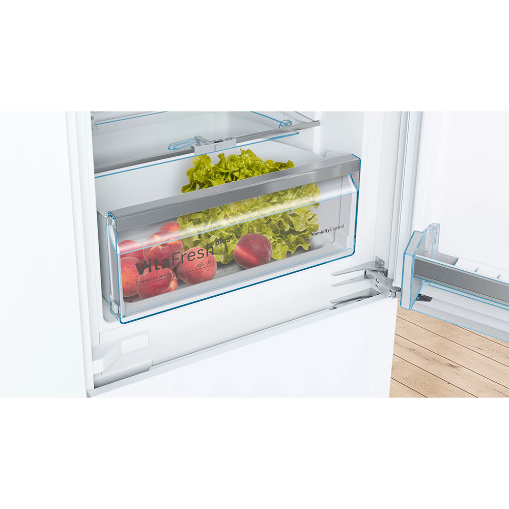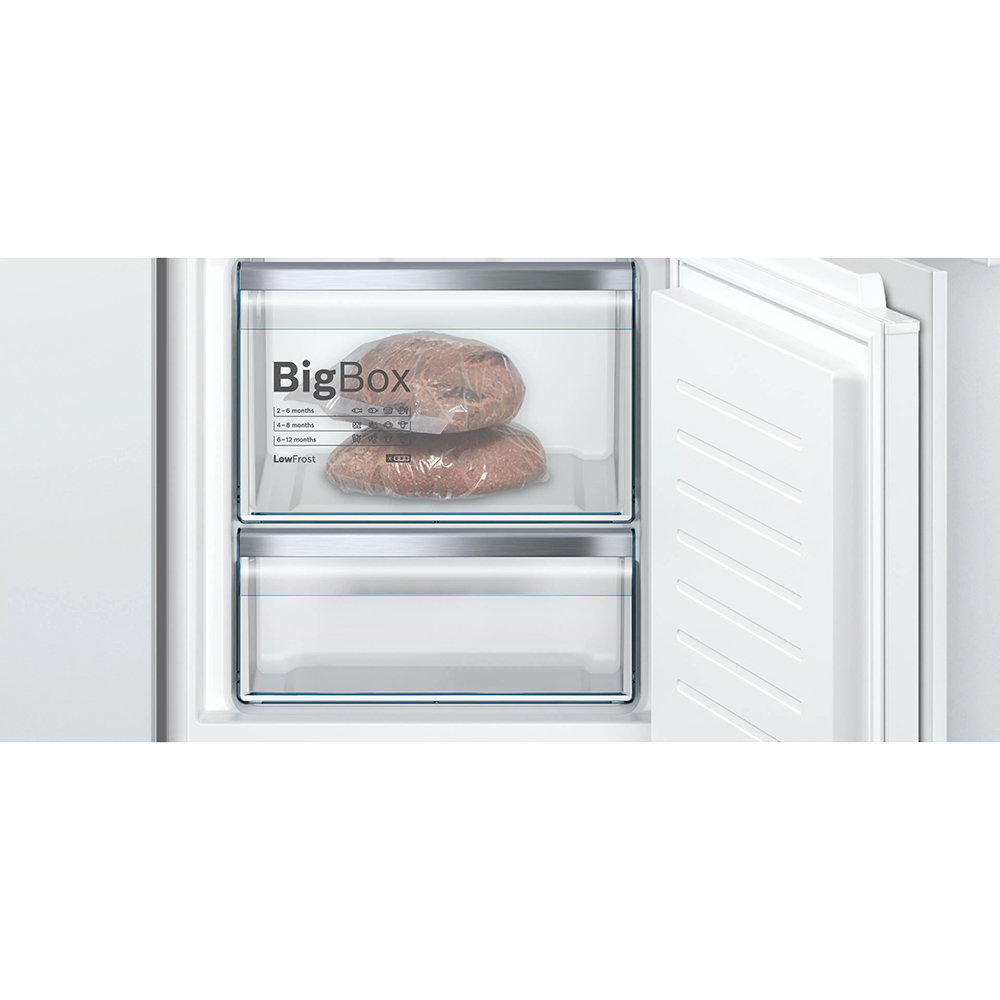 Vgradni hladilnik z zamrzovalnikom Bosch KIS87AFE0. LED luči uvajajo povsem nov koncept osvetlitve hladilnika in zagotavljajo enakomerno osvetlitev brez odseva. Za več prostora lahko brez težav odstranite vse steklene police iz zamrzovalnega dela. S funkcijo super zamrzovanja lahko hitreje zamrznete manjše količine živil, hkrati pa preprečite odmrzovanje že zamrznjenih živil. Zamrzovalnik zazna povišanje temperature in jo samodejno uravnava, da zagotovi optimalne pogoje shranjevanja. Zelo globok zamrzovalnik za razporeditev posod z zamrznjeno hrano ali večjih zamrznjenih živil.