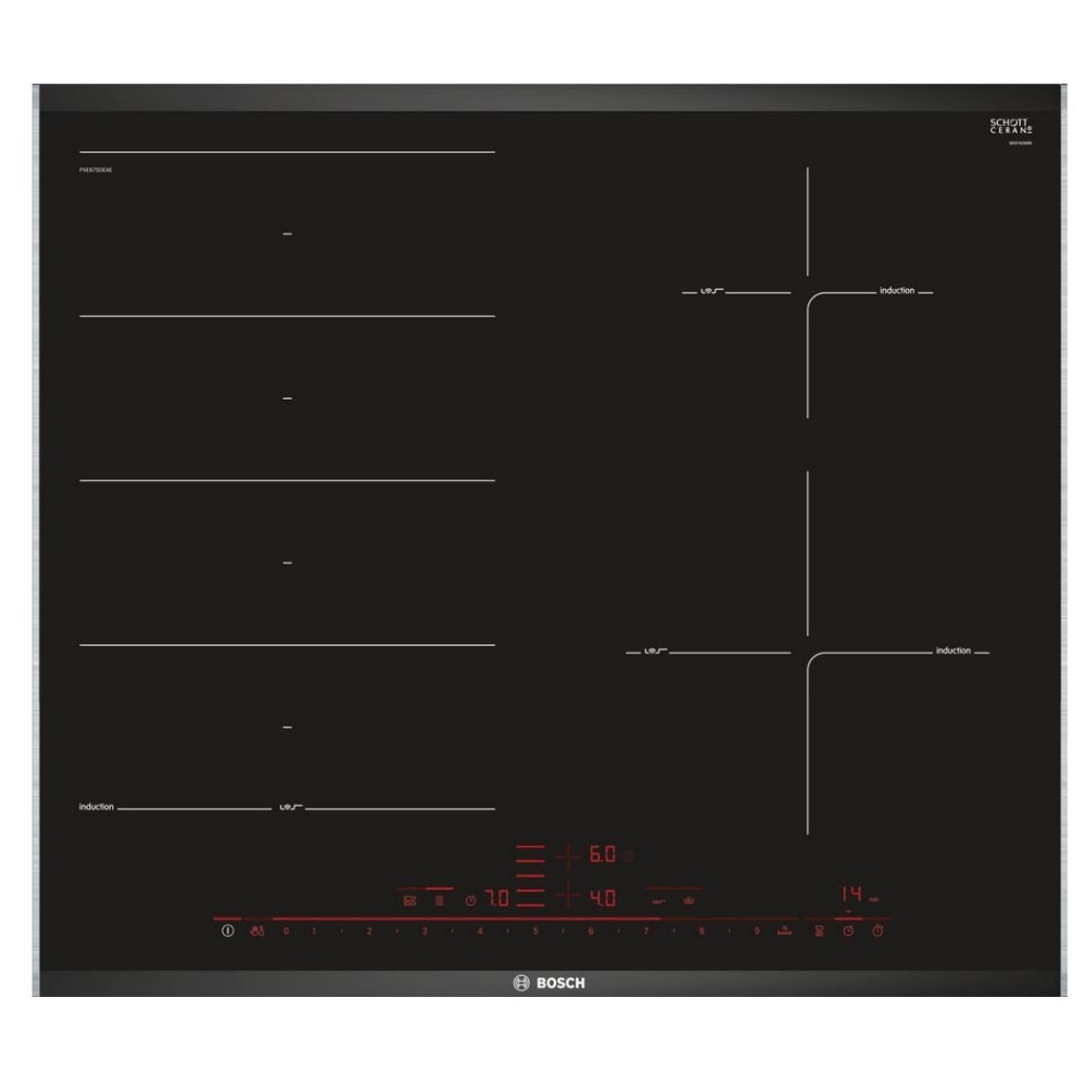 Indukcijska plošča Bosch PXE675DE4E se ponaša z napredno senzoriko. Ima PerfectFry senzor za popoln nadzor nad kuhanjem ter 5 stopenj moči. Ima možnost povečanja moči PowerBoost za vsa kuhališča ter posebno PanBoost funkcijo povečanja moči za ponve, ki je primerna predvsem za woke, kjer potrebujete višjo temperaturo. Plošča ima moderen ter minimalističen stil. Spodnji rob je brušen, prav tako pa ima stranske okrasne letvice. Z indukcijsko kuhalno ploščo boste sedaj kuhali hitreje, porabili manj energije, ploščo pa je prav tako enostavno očistiti.