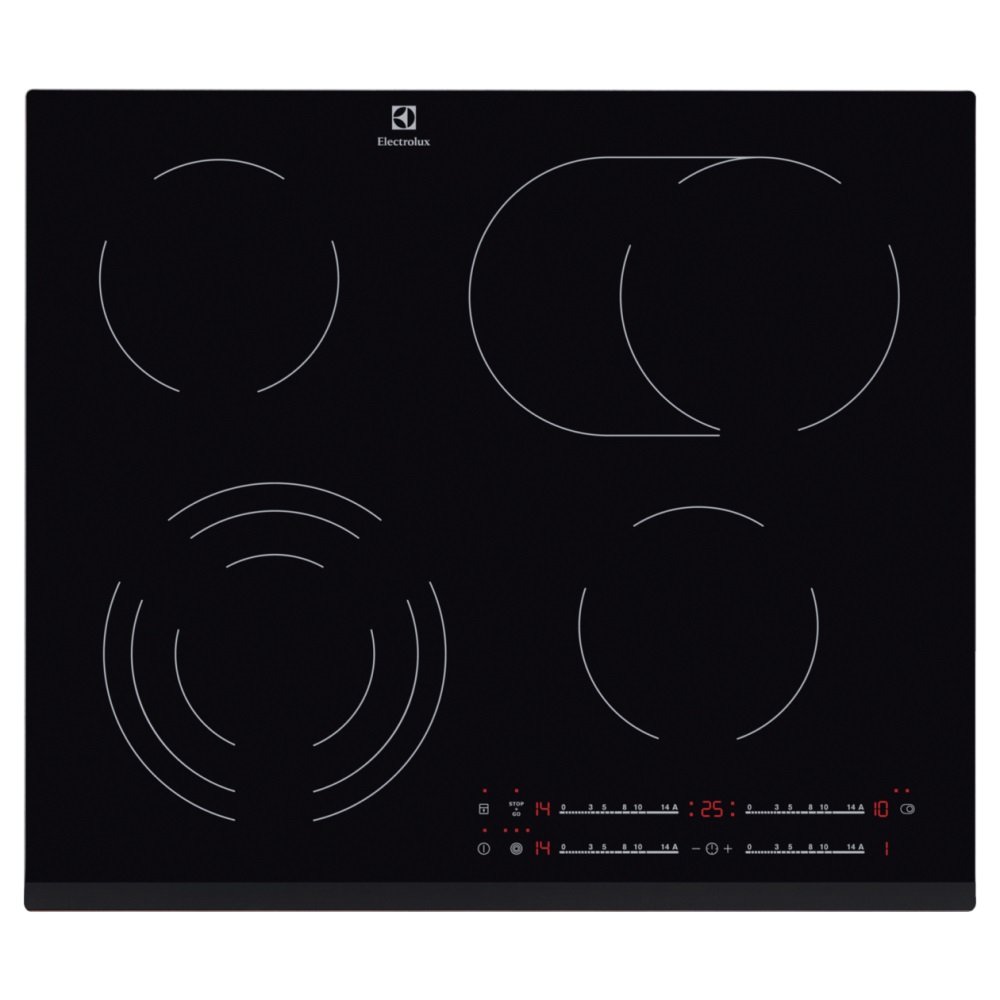 Steklokeramična kuhalna plošča Electrolux EHF6547FXK ima 2 enokrožna, 1 razširljivo ovalno in 1 trokrožno kuhališče. Moč posameznega kuhališča nastavite z drsnim upravljanjem na dotik s funkcijo Direct Touch. Indikatorji preostale temperature vas ves čas opozarjajo na to, katera kuhališča so vroča. Za varnost kuhalne plošče skrbi varnostno zaklepanje, ki prepreči nenameren vklop kuhališč in samodejni izklop z zvočnim signalom. Plošča ima tudi funkcijo Stop&Go za krajše prekinitve kuhanja in nastavljivi timer z izklopom. Steklokeramično površino te kuhalne plošče je nadvse preprosto čistiti, saj ploščo enostavno obrišete.