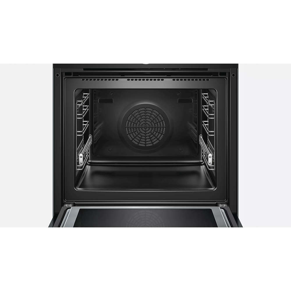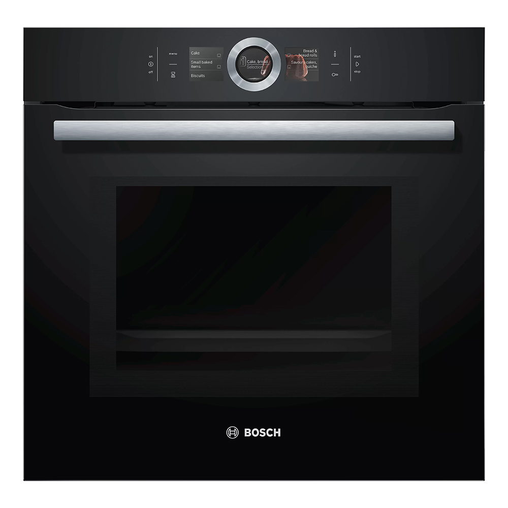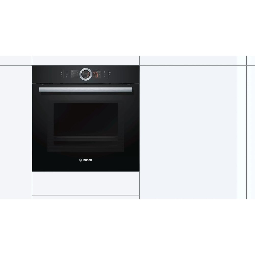 Vgradna pečica z mikrovalovno funkcijo Bosch HMG6764B1 serije 8. Za optimalne rezultate pečenja senzor PerfectBake analizira vlažnost v pečici in samodejno spremeni način ogrevanja, čas pečenja in temperaturo. Tri izjemno občutljive merilne konice na mesni sondi PerfectRoast omogočajo senzorju, da izračuna idealno temperaturo središča hrane do stopinje in sekunde. Ponev ali rešetko postavite na katero koli od štirih ravni za dosledno popolne rezultate s 4D vročim zrakom. Če niste prepričani, katero nastavitev pečice uporabiti, vam pomaga funkcija Assist.