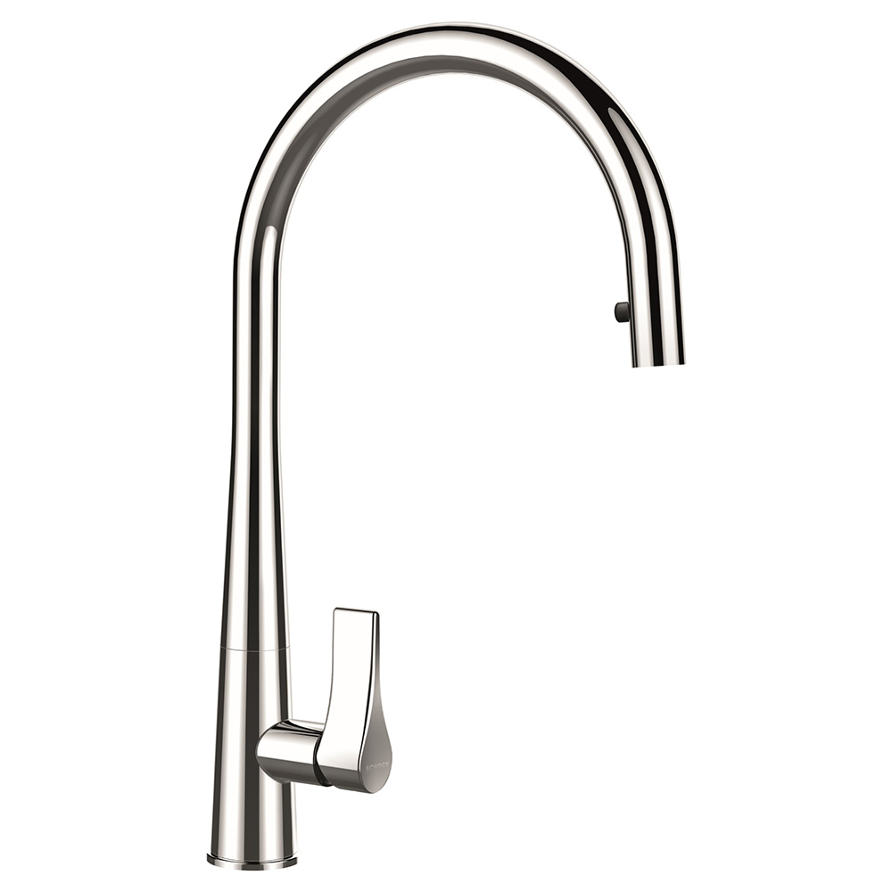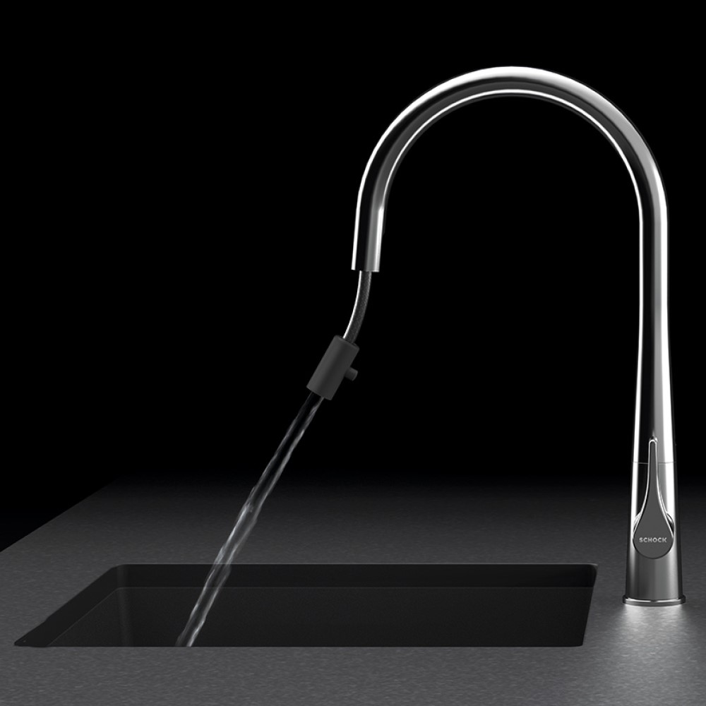 Kuhinjska armatura SCHOCK Gota v kromirani izvedbi z ekstra visokim izlivom je prava paša za oči. Njenemu elegantnemu dizajnu se lepo poda pomivalno korito SCHOCK Mono N-100 ali Kallio M-175.
