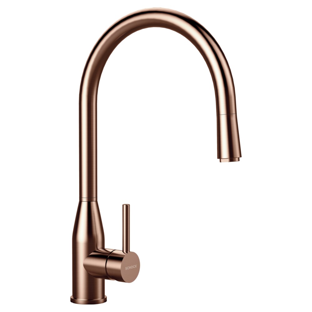 Kuhinjska armatura SCHOCK Kavus 559120 v bakreni brušeni barvi Copper ima izjemno prefinjen in eleganten dizajn, zato se zraven nje zelo lepo poda pomivalno korito SCHOCK Formhaus. Izdelana je iz brušenega plemenitega jekla, nato pa še galvansko obdelana, kar omogoča, da kuhinjska armatura dobi posebno barvo, hkrati pa postane še bolj korozijsko zaščitena ter obstojna.