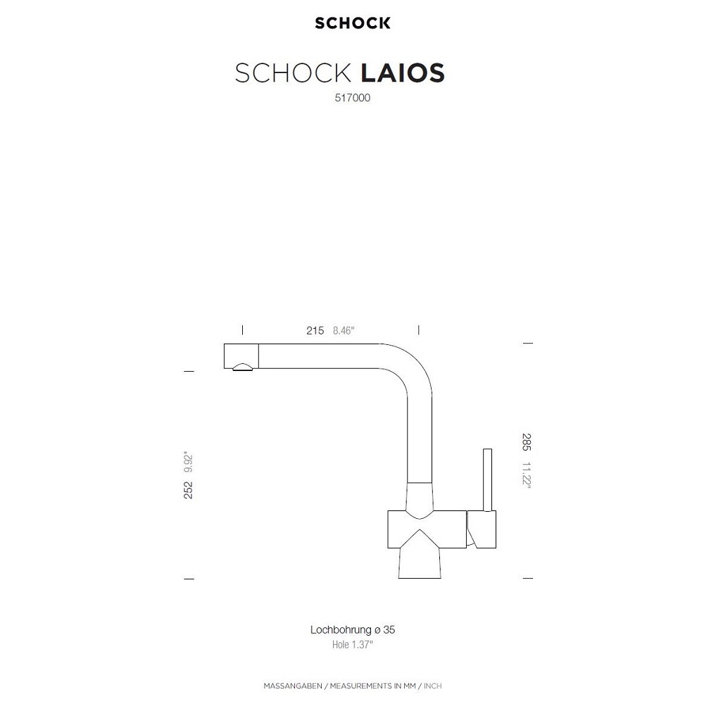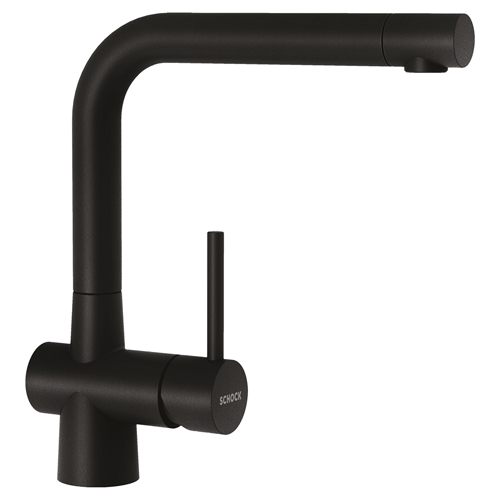 Kuhinjska armatura SCHOCK Laios 517000 je zaradi svojega privlačnega videza izjemno priljubljena v modernih kuhinjah. Lepo se ji poda tudi pomivalno korito SCHOCK Tia D-100. Na voljo je v tej črni barvi Puro, v ponudbi pa je tudi še v devetih drugih barvah. Lahko se dobi tudi v izvedbi z izvlečno ročko (Laios 517120) ali v izvedbi za namestitev pod okno (Laios 517005 ali Laios 517125).