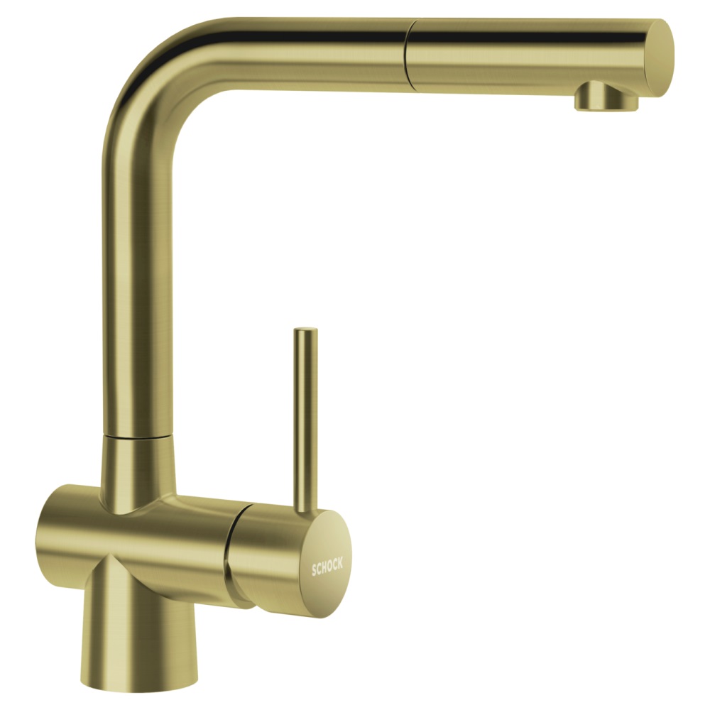 Kuhinjska armatura SCHOCK Laios 517120 je zaradi svojega privlačnega videza izjemno priljubljena v modernih kuhinjah. Lepo se ji poda tudi pomivalno korito SCHOCK Tia D-100. Na voljo je v tej zlati barvi White Gold, v ponudbi pa je tudi še v devetih drugih barvah. Lahko se dobi še v treh drugih izvedbah: brez izvlečne ročke (Laios 517000), za namestitev pod okno brez izvlečne ročke (Laios 517005) ali za namestitev pod okno z izvlečno ročko (Laios 517125).