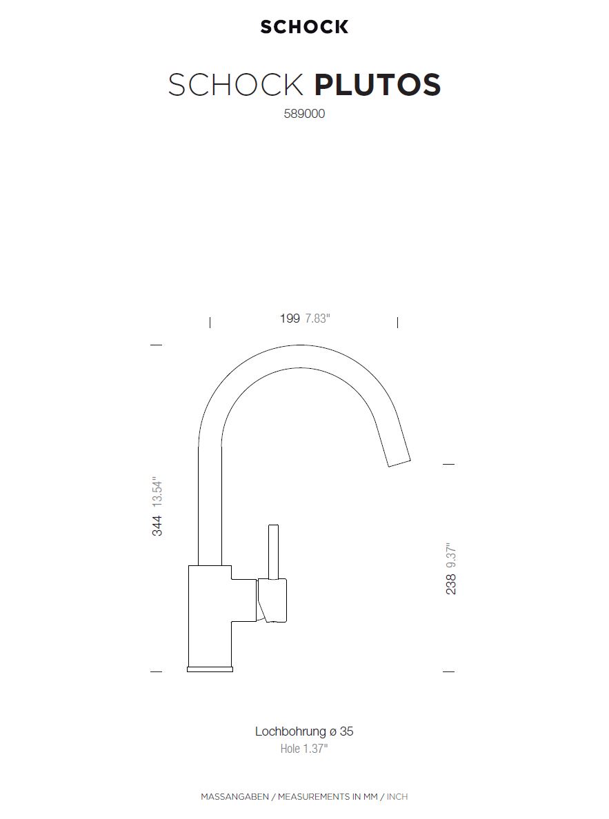 Kuhinjska armatura SCHOCK Plutos 589000 je klasična armatura, ki je zaradi svojega enostavnega, a elegantnega videza izjemno priljubljena v modernih kuhinjah. Lepo se ji poda pomivalno korito SCHOCK Greenwich. Na voljo je v tej črni barvi Onyx, v ponudbi pa je na voljo še v šestih drugih barvah. V vseh teh barvah se lahko dobi tudi v izvedbi z izvlečno ročko (Plutos 589120 in 589121).