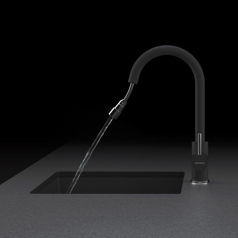 Kuhinjska armatura SCHOCK Plutos 589121 je klasična izvlečna armatura, ki je zaradi svojega enostavnega, a elegantnega videza izjemno priljubljena v modernih kuhinjah. Lepo se ji poda pomivalno korito SCHOCK Greenwich. Na voljo je v tej črni barvi Onyx, v ponudbi pa je na voljo še v šestih drugih barvah (Plutos 589120 in 589121). V vseh teh barvah se lahko dobi tudi v izvedbi brez izvlečne ročke (Plutos 589000).