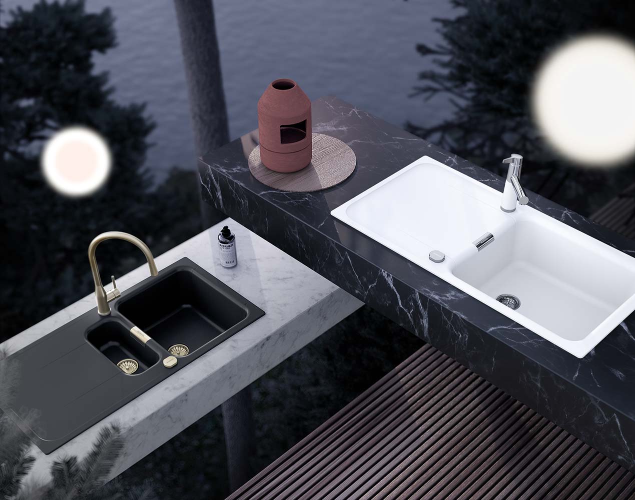 Kuhinjska armatura SCHOCK SC-510 je klasična brezčasna armatura, ki je delno kromirana, delno pa jo sestavlja naravni kamen. V tej beli barvi Day se ji zelo lepo poda pomivalno korito SCHOCK Greenwich v isti barvi.