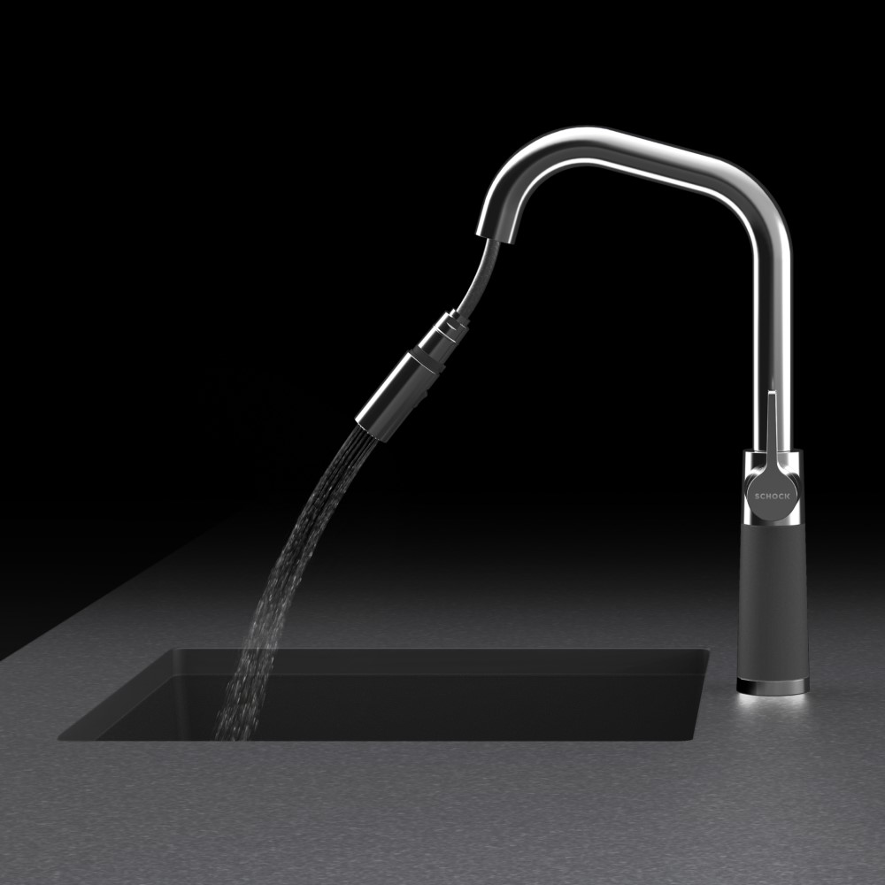 Kuhinjska armatura SCHOCK SC-530 556120 je elegantna armatura z visokim izlivom. En del armature je kromiran, drugi del pa je narejen iz naravnega kamna Cristadur®. Kamniti del armature je popolnoma enak kot pri pomivalnih koritih SCHOCK, zato lahko s to armaturo dosežete popolno ujemanje z vašim kamnitim koritom SCHOCK.