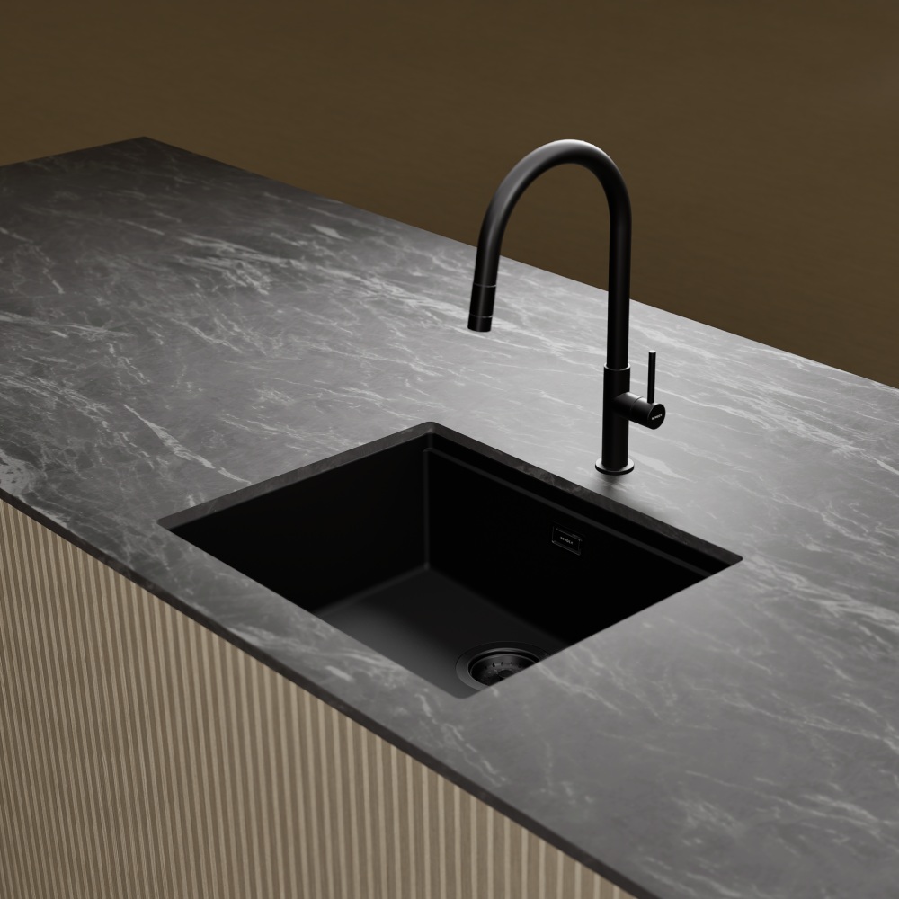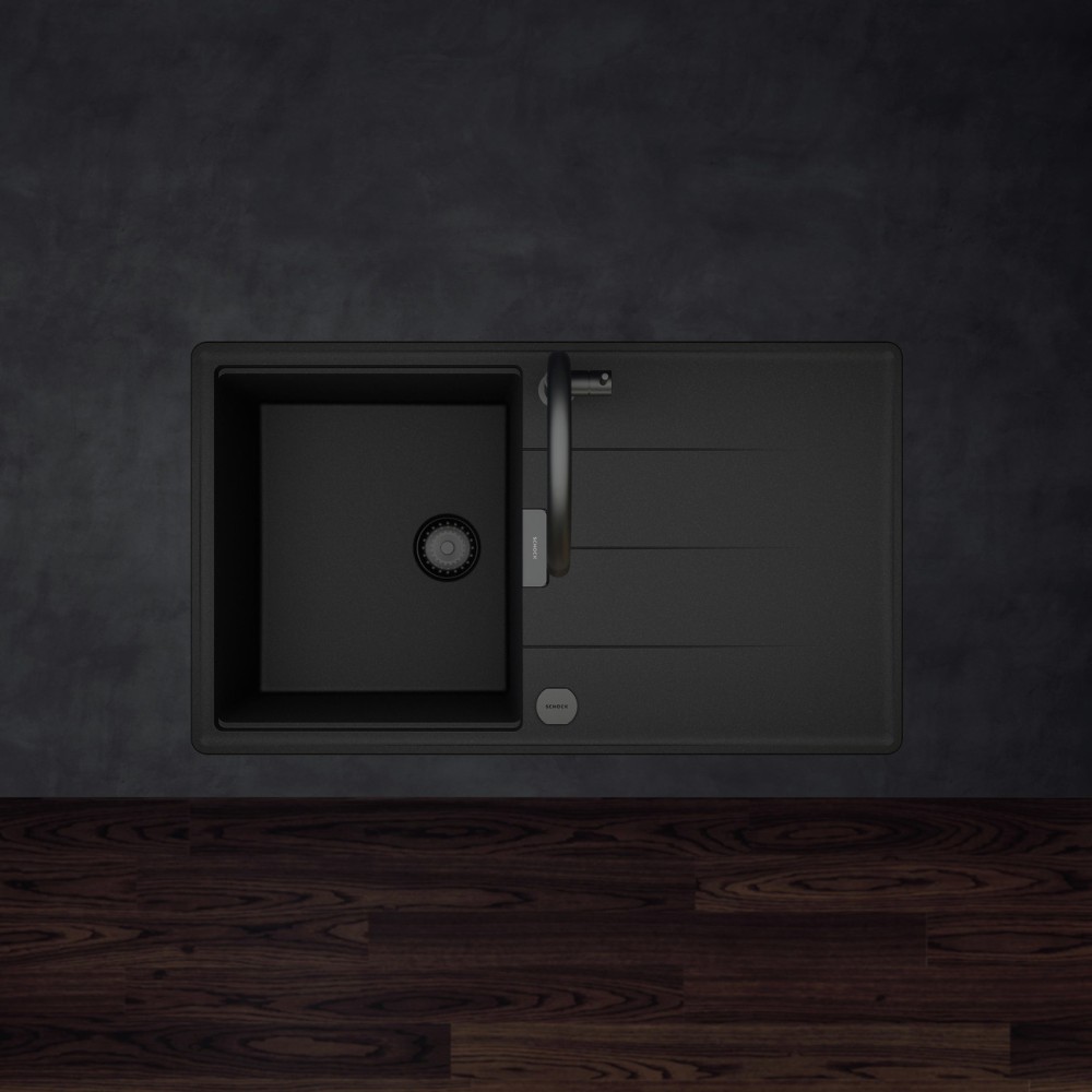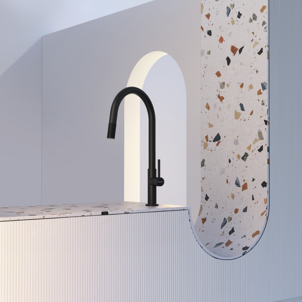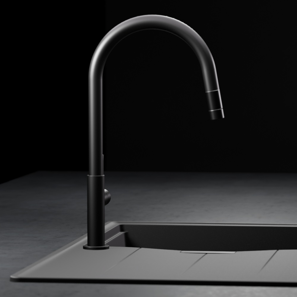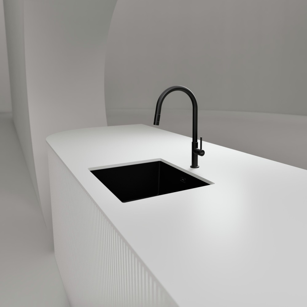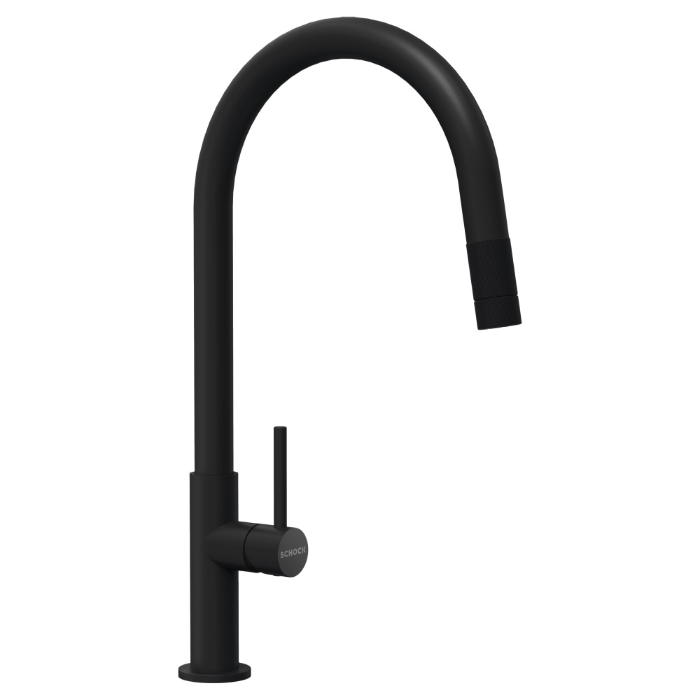Armatura ima prav tako izvlečno ročko s kroglično glavo za maksimalno fleksibilnost ter možnost navadnega curka vode ali tuša za večjo učinkovitost čiščenja posode. Armaturi se lepo podajo vsa podvgradna korita kot so Schock Greenwich ali Kiruna. Na voljo je v tej črni barvi Black, v ponudbi pa je tudi v barvi plemenitega jekla.