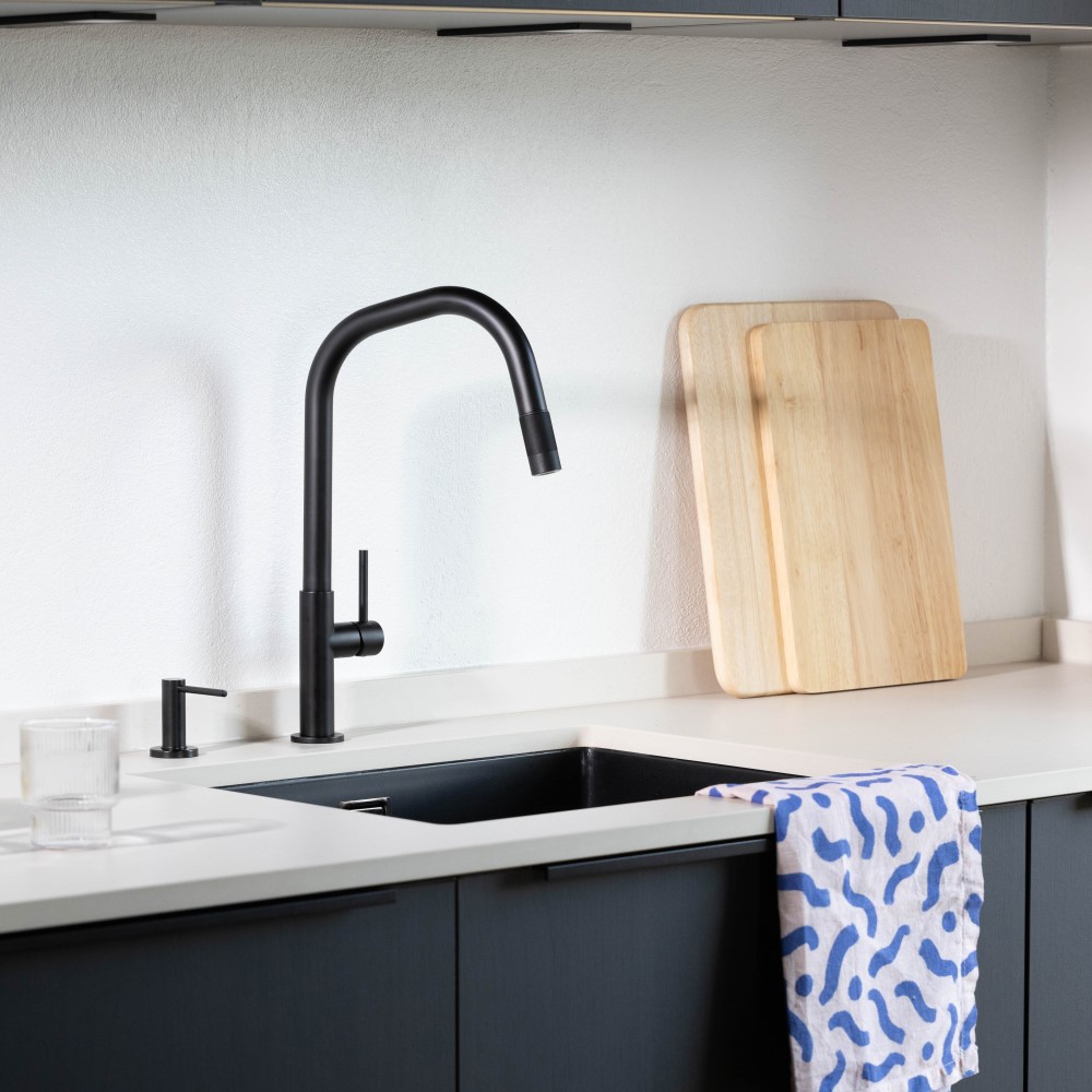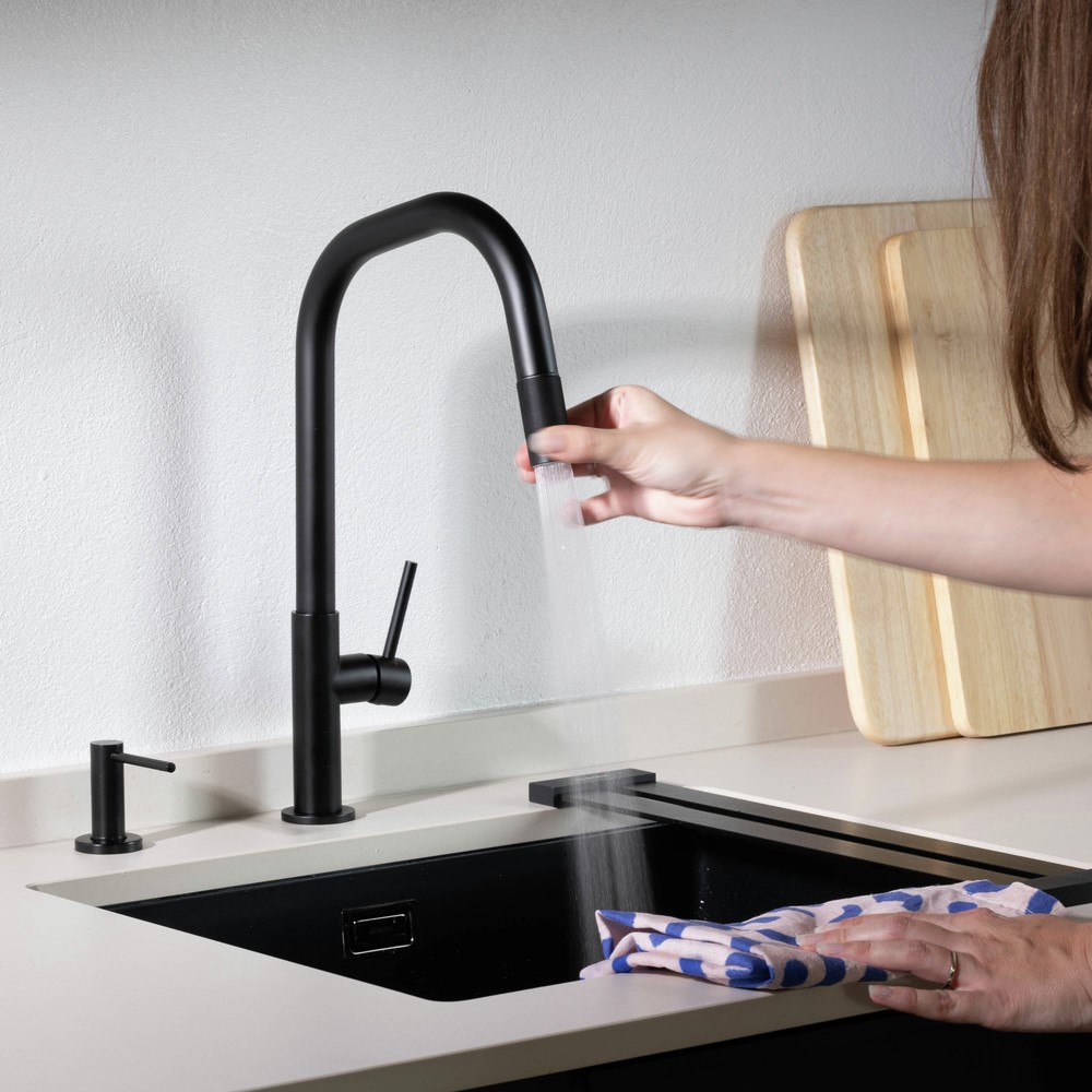 Armatura ima izvlečno ročko s kroglično glavo za maksimalno fleksibilnost ter možnost navadnega curka vode ali tuša, če želite še večjo učinkovitost čiščenja posode. Armaturi se lepo podajo vsa podvgradna korita kot so Schock Kiruna ali Greenwich. Na voljo je v tej črni barvi Black, v ponudbi pa je tudi v barvi plemenitega jekla.