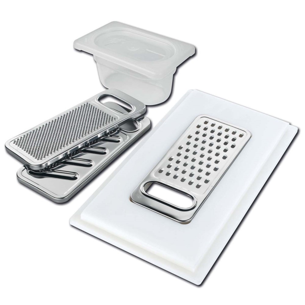 Set strgalnikov Foster 8159 101 z držalom za obroče in posodico za zbiranje hrane. Z strgalnikom boste lahko priročno naribali vse oblike zelenjave, prav tako pa tudi čokolade, sir ipd. Bodite kreativni, da bodo jedi še okusnejše!