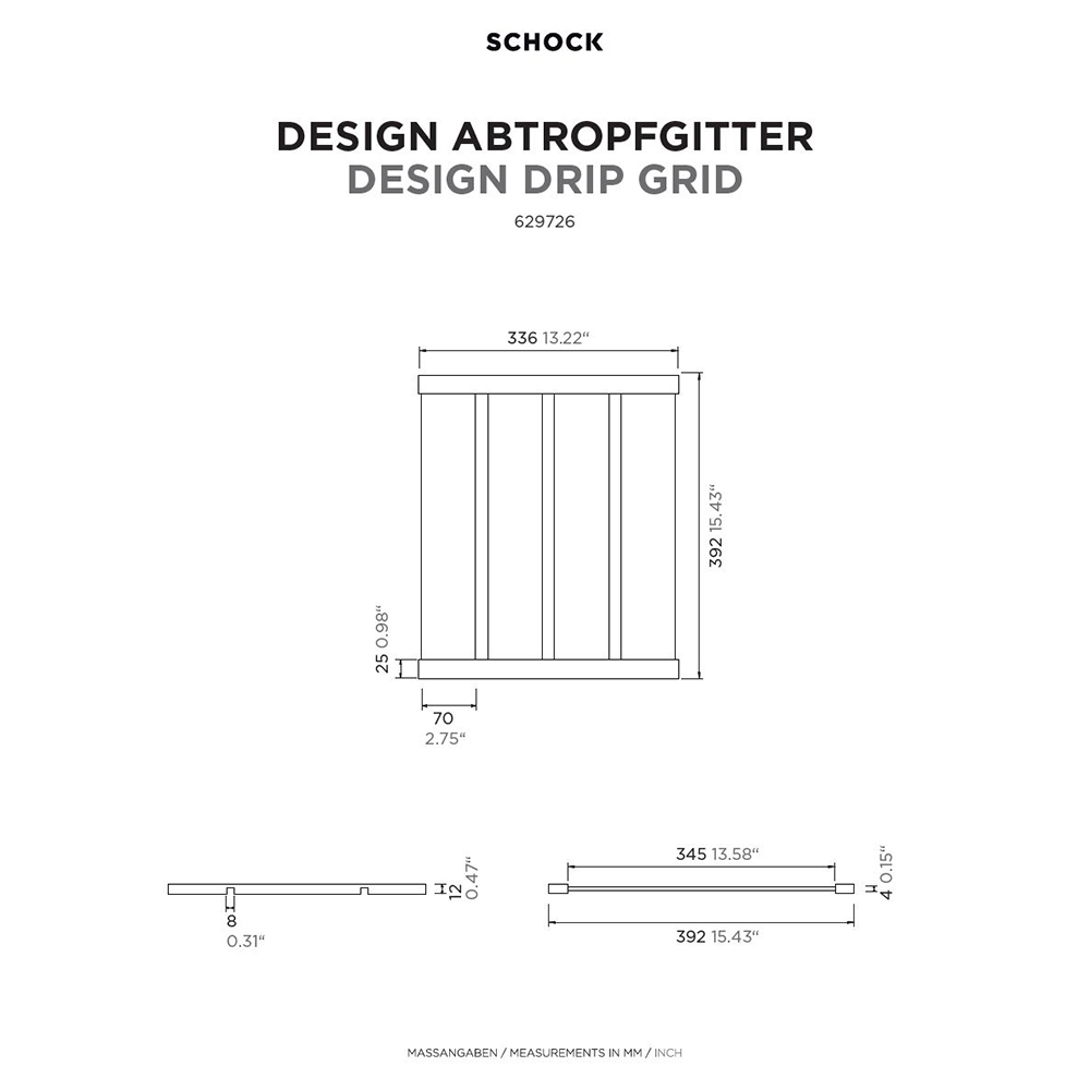 Odcejalnik Schock 629726COP je dizajnerski odcejalnik za pomivalna korita Schock. Narejen je iz aluminija v stilu brušenega plemenitega jekla. Odcejalnik je možno dobiti tudi v srebrni (629726EDM) in črni barvi (629726S), vsi trije pa se fantastično podajo mnogim pomivalnim koritom SCHOCK (seznam kompatibilnih korit med tehničnimi podatki). Odcejalnik je odličen dodatek predvsem pomivalnim koritom brez odcejalnega dela, lahko pa ga uporabite tudi kot podaljšan odcejalnik vašemu koritu, če ta že ima odcejalni del.