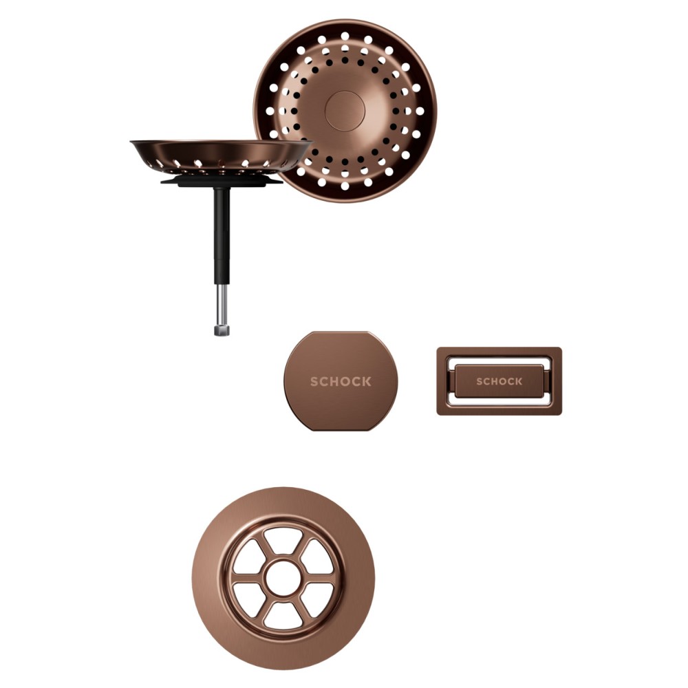 Vsako korito SCHOCK iz linije Cristadur® lahko opremite s setom izliv, preliv in gumb v petih barvah: srebrni (EDM), belo-zlati (White Gold), brušeni bakreni (Copper), brušeni temno sivi (Gunmetal) ter črni (Puro).