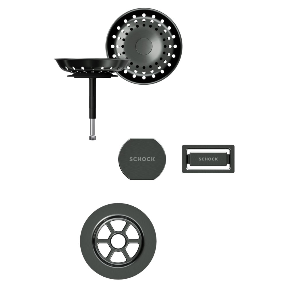 Vsako korito SCHOCK iz linije Cristadur® lahko opremite s setom izliv, preliv in gumb v petih barvah: srebrni (EDM), belo-zlati (White Gold), brušeni bakreni (Copper), brušeni temno sivi (Gunmetal) ter črni (Puro).