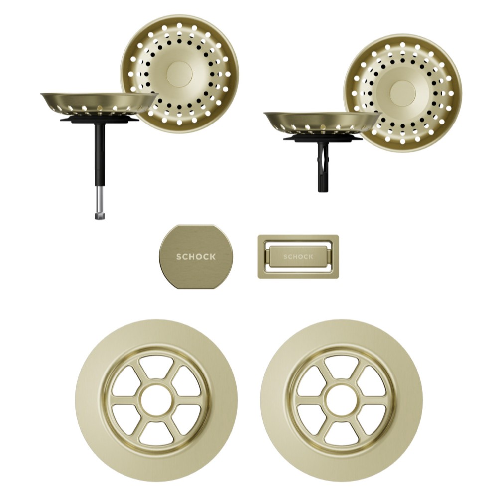 Vsako korito SCHOCK iz linije Cristadur® lahko opremite s setom izliv, preliv in gumb v petih barvah: srebrni (EDM), belo-zlati (White Gold), brušeni bakreni (Copper), brušeni temno sivi (Gunmetal) ter črni (Puro).