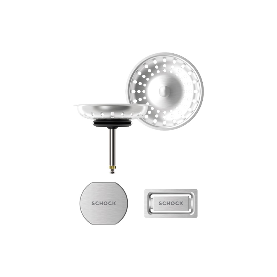 Vsako korito SCHOCK iz linije Cristadur® lahko opremite s setom izliv, preliv in gumb v petih barvah: srebrni (EDM), belo-zlati (White Gold), bakreni (Copper), temno sivi (Gunmetal) ter črni (Puro).