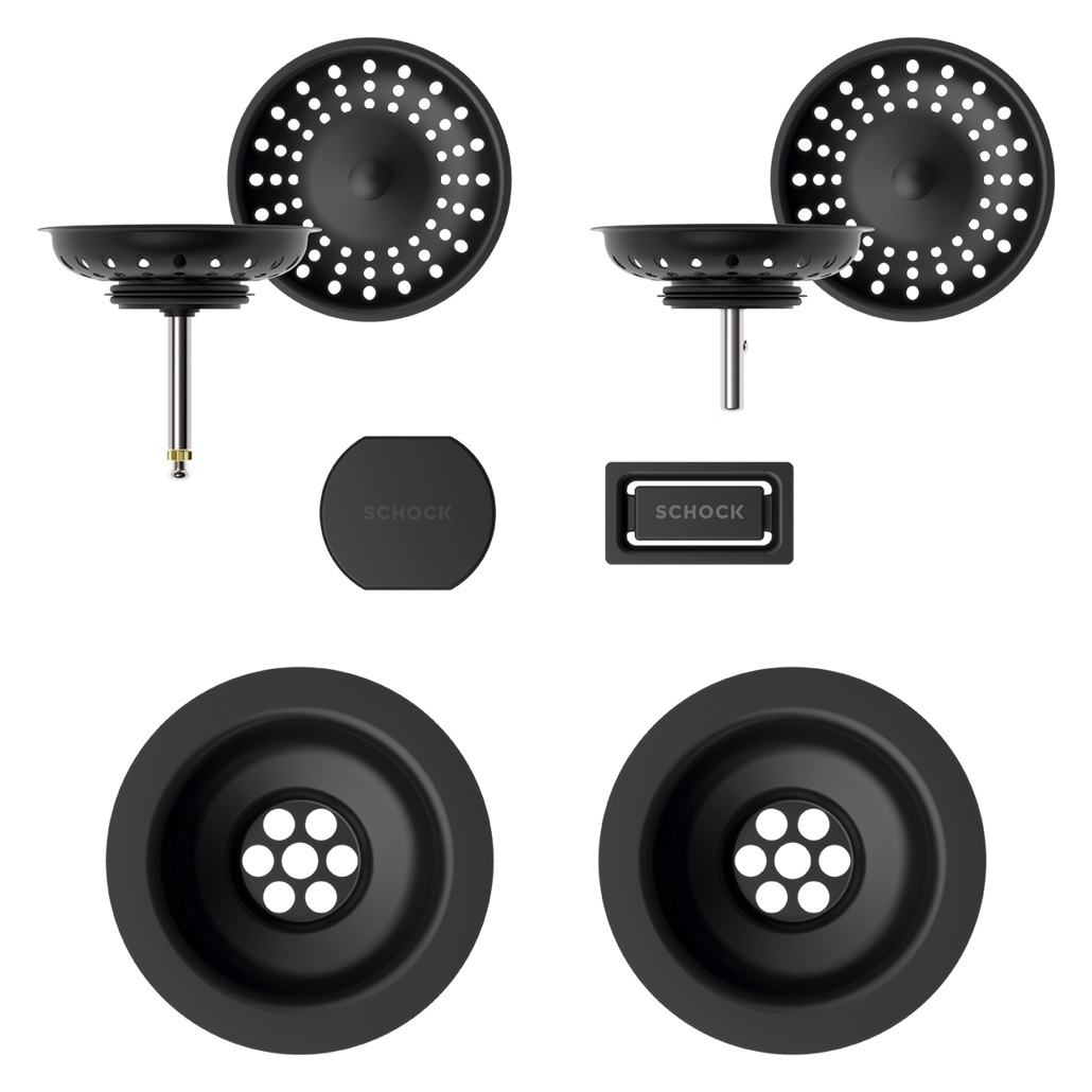 Vsako korito SCHOCK iz linije Cristadur® lahko opremite s setom izliv, preliv in gumb v petih barvah: srebrni (EDM), belo-zlati (White Gold), bakreni (Copper), temno sivi (Gunmetal) ter črni (Puro).