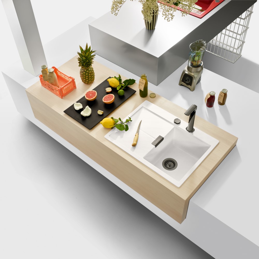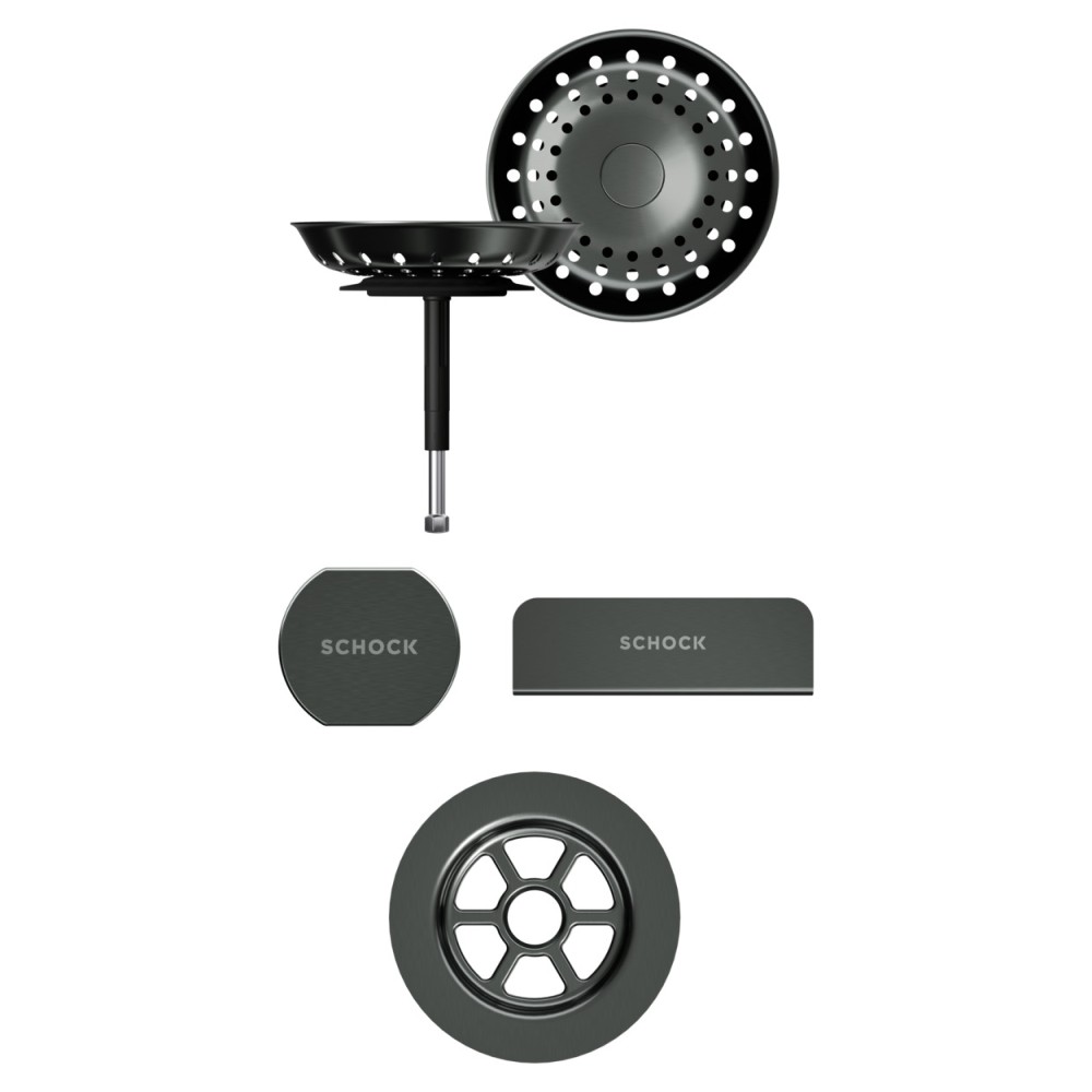 Vsako korito SCHOCK iz linije Cristadur® lahko opremite s setom izliv, preliv in gumb v petih barvah: srebrni (EDM), belo-zlati (White Gold), brušeni bakreni (Copper), brušeni temno sivi (Gunmetal) ter črni (Puro).