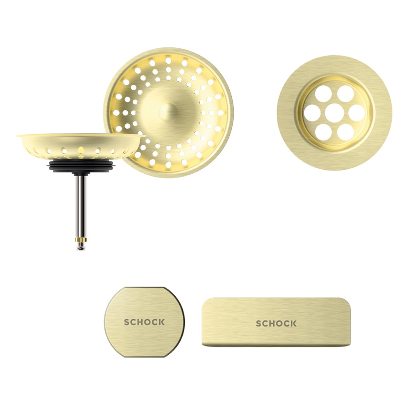 Vsako korito SCHOCK iz linije Cristadur® lahko opremite s setom izliv, preliv in gumb v petih barvah: srebrni (EDM), belo-zlati (White Gold), bakreni (Copper), temno sivi (Gunmetal) ter črni (Puro).