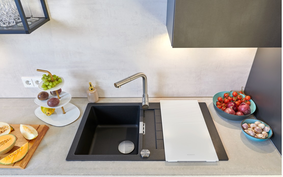 Deska za rezanje, ki jo lahko premikate levo in desno po zunanjem robu pomivalnega korita s pomočjo posebnih vodil, tako da je možen položaj deske po celotnem področju korita.
