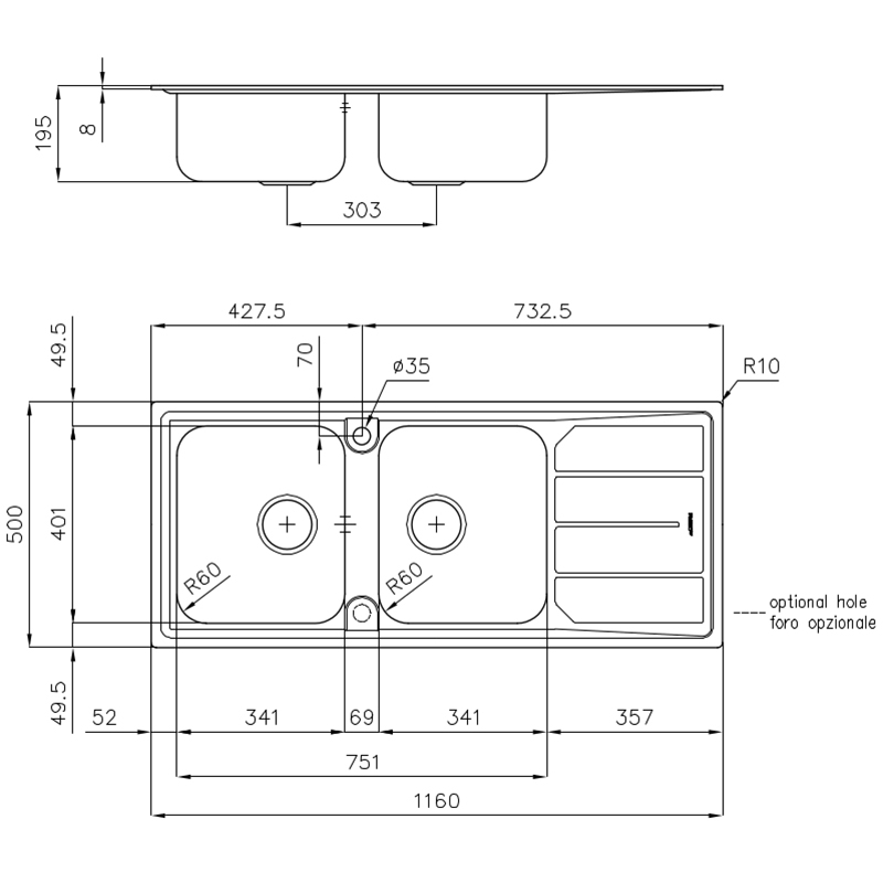 Pomivalno korito Foster Elettra 5812 062 je funkcionalno korito, ki ima dve posodi za različna kuhinjska opravila. Izdelan je iz vrhunskega nerjavečega jekla AISI 304 s Foster brušenim zaključkom, ki ustvarja prefinjeno in trpežno površino. Ima dve enako veliki posodi, vsaka z velikim 3,5" odtokom in priročnim pokrovom košare, ki preprečuje odvajanje trdih delov. Ima tudi standardni 8 mm rob, ki omogoča gladko in čisto namestitev in čiščenje. Zasnovano je tako, da se prilega podstavku 80-90 cm. Pomivalnemu koritu so priloženi vsi potrebni dodatki, kot so pritrdilne kljuke, tesnilo, preliv in sifon ter ga je mogoče prilagoditi z dodatnimi predmeti, kot so deske za rezanje, košare, stojala za krožnike ali sklede.