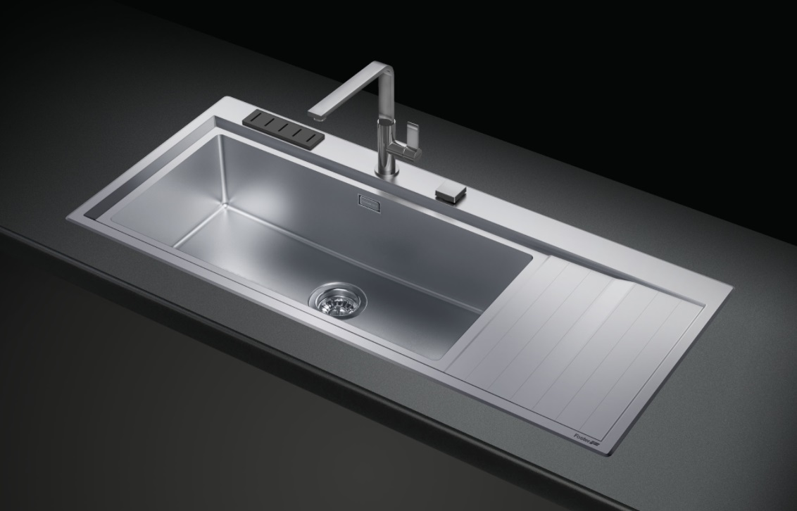 Foster pomivalno korita Stripe ima poleg estetsko oblikovanega oglatega varnostnega preliva v serijski opremi še gumb za odpiranje izliva in prostor za dodatne izvrtine za dozirnik. Prilega pa se lepa deska za rezanje za doplačilo.