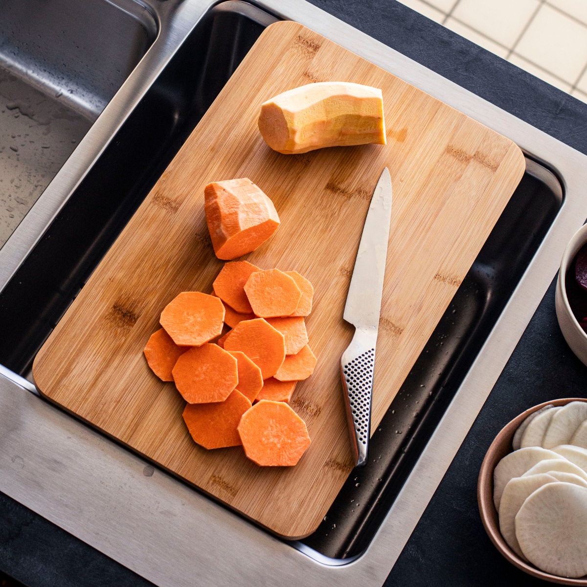 Koritu prilagamo tudi novo desko za rezanje iz bambusovega lesa – trajnostno, vzdržljivo in privlačno rešitev za UNA-jev vsestranski asortiman.