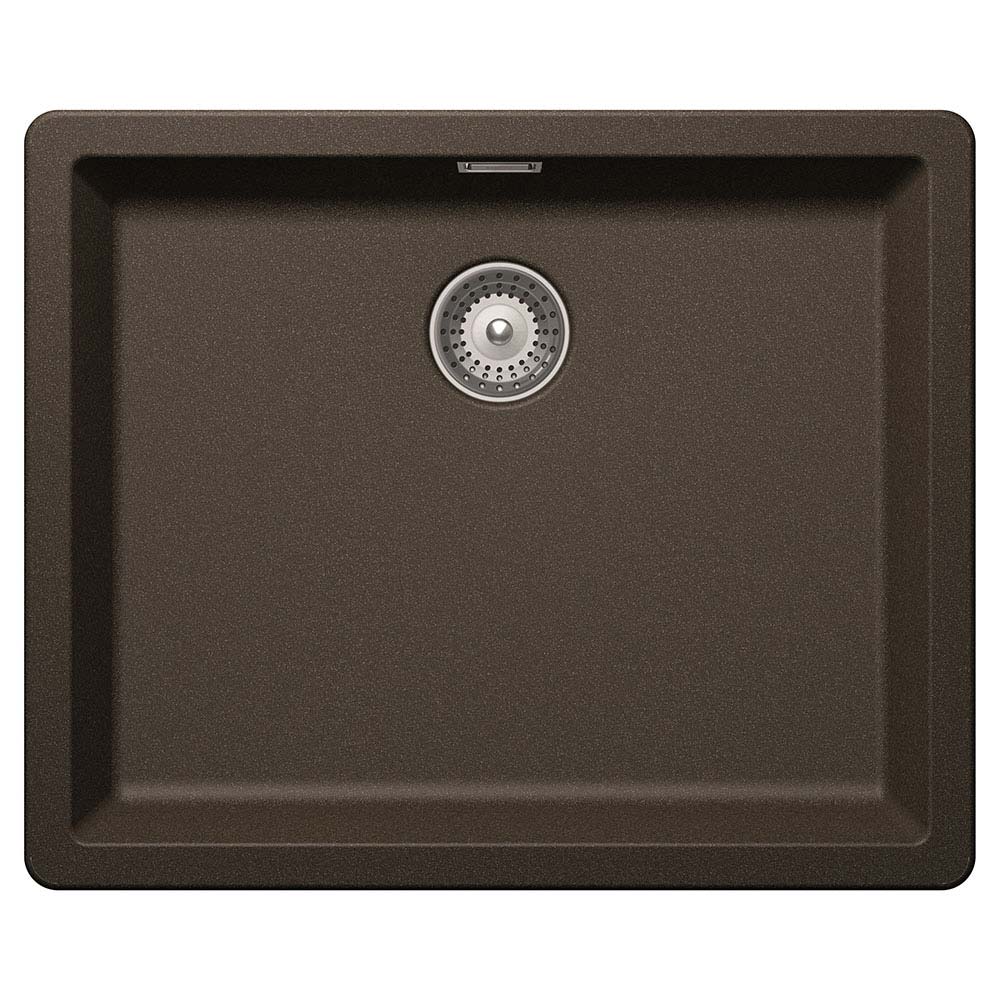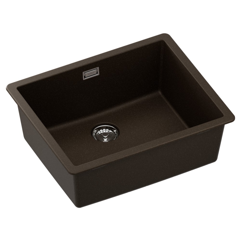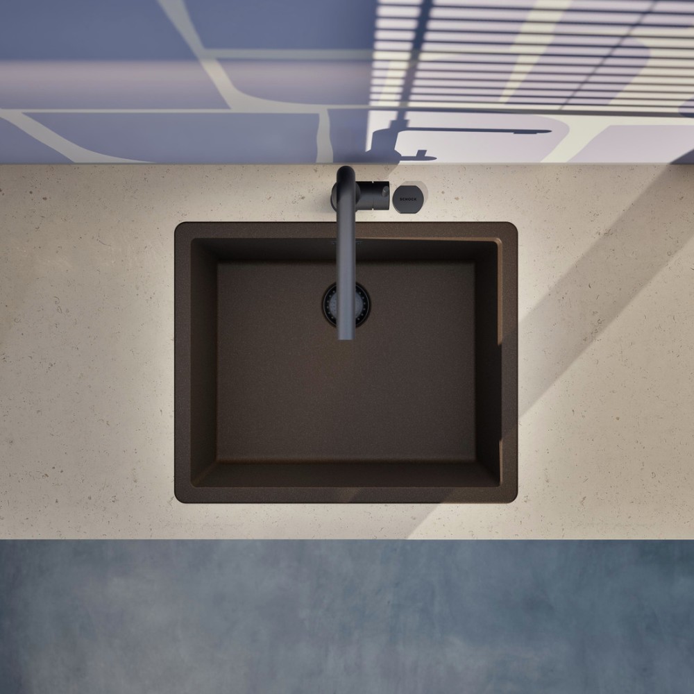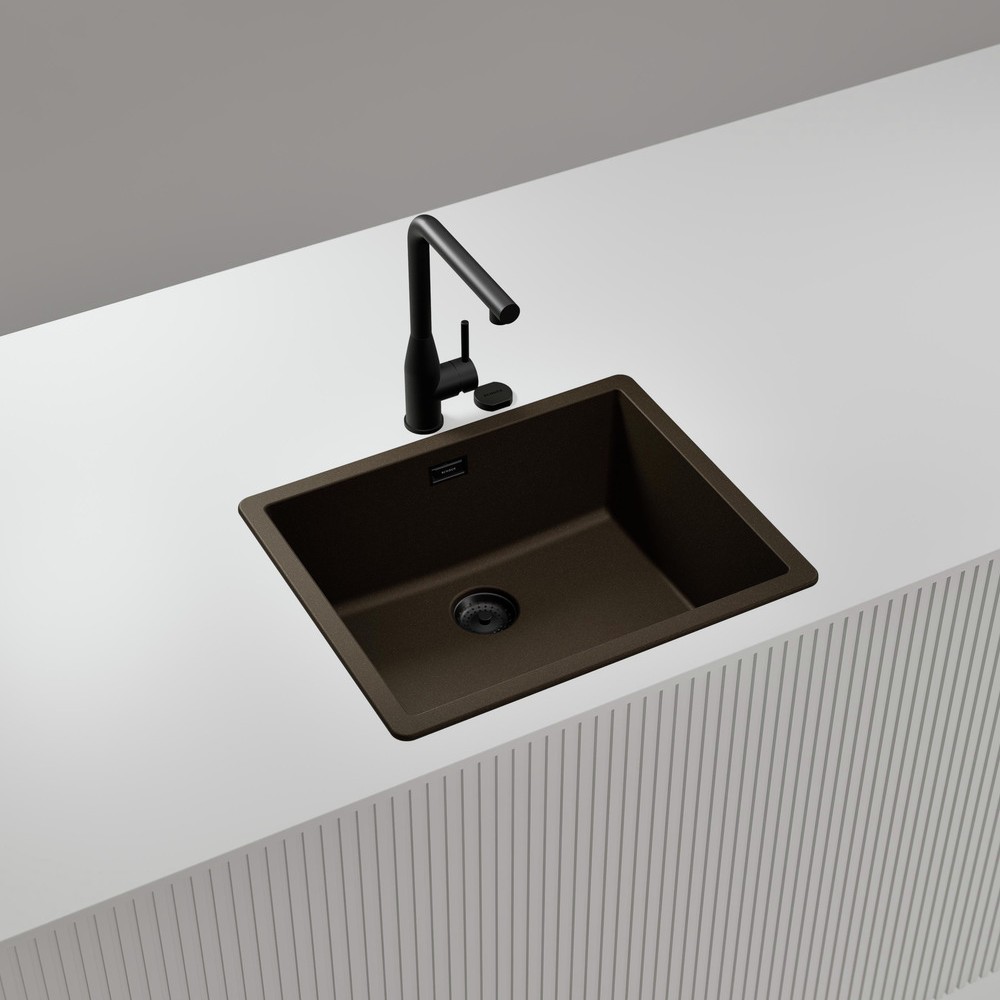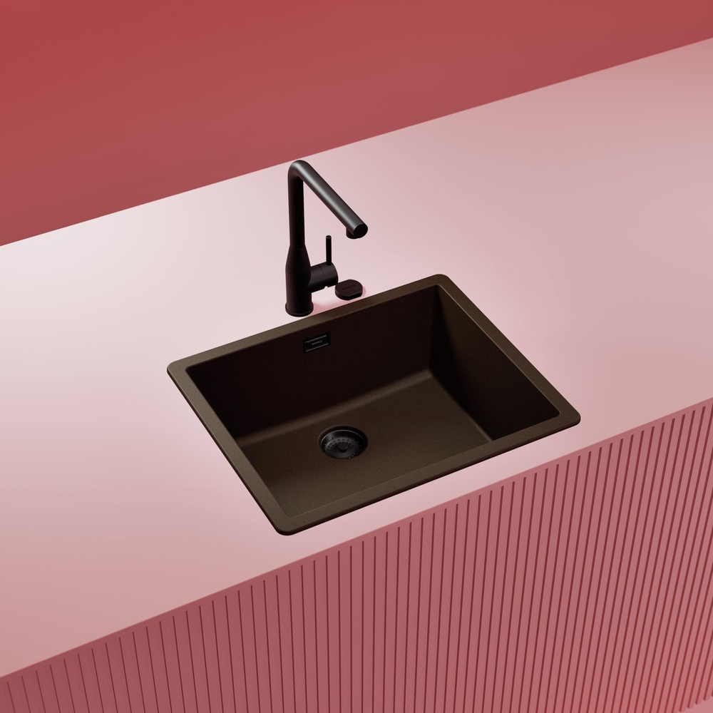 Za svilnat otip poskrbi visokokakovosten material Cristadur®, zraven te temne barve Bronze je pa na voljo še v petih drugih barvah. To pomivalno korito lahko opremite z LED razsvetljavo ter različnimi dodatki kot so izlivno prelivna garnitura v različnih barvnih obdelavah, cedilo, odcejalnik iz silikona, praktična kotna posodica, gumb za odpiranje in zapiranje izliva ter različnimi dozirniki za milo.
