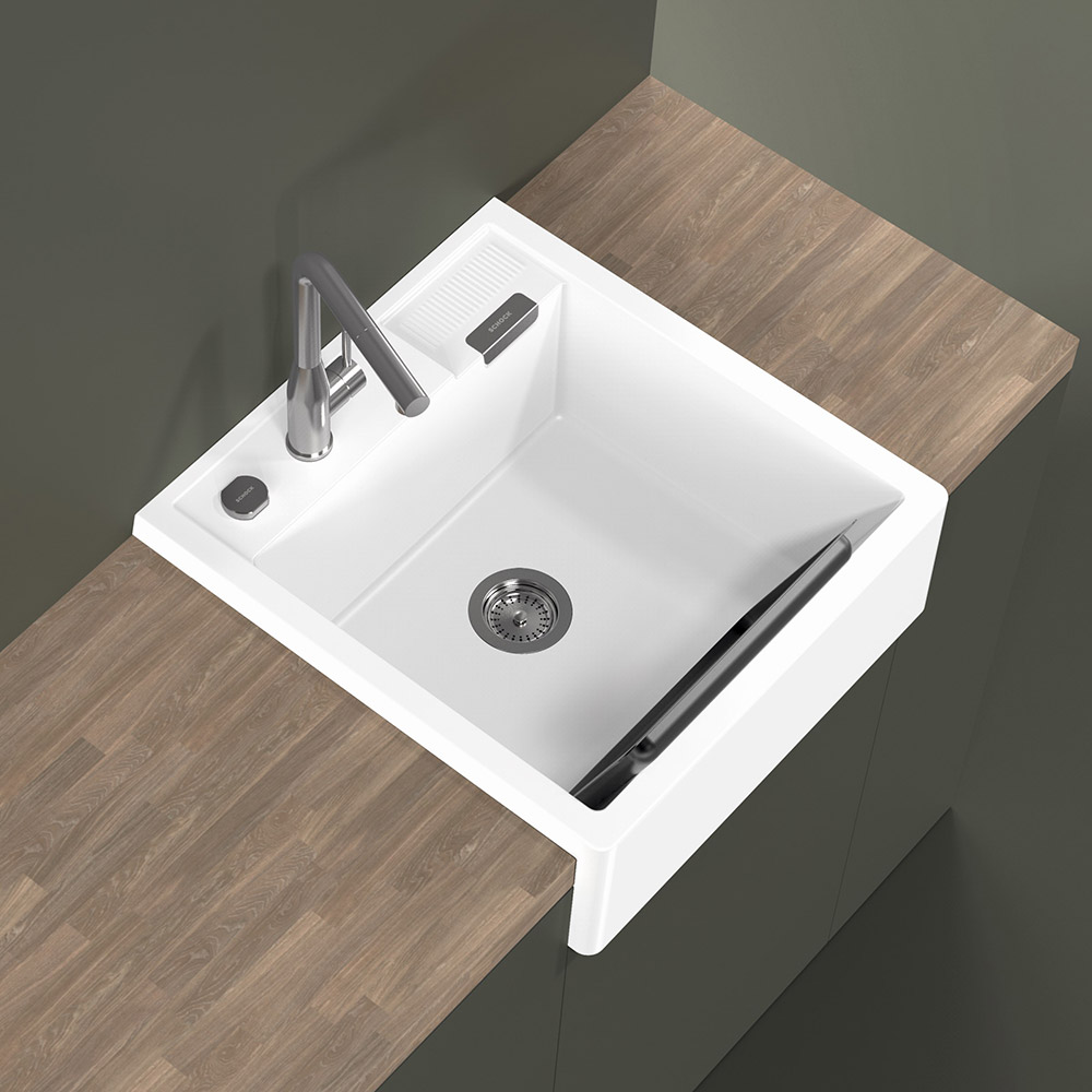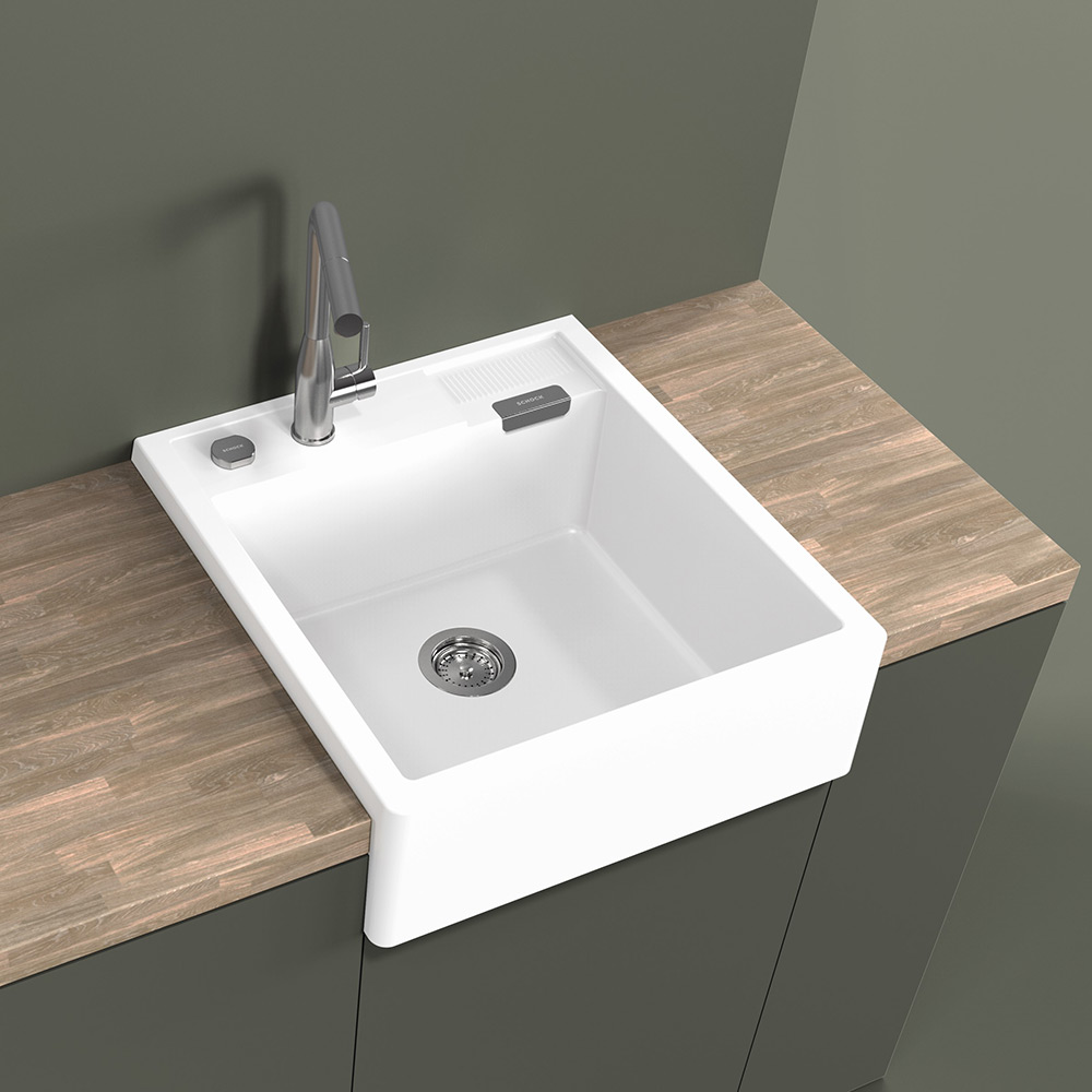 Pomivalno korito SCHOCK Kallio M-100 je mogočno in trpežno pomivalno korito. Na voljo je v tej beli barvi Day, dobavljivo pa je še v treh drugih barvah CRISTADUR® GreenLine. Gre za nasadno pomivalno korito, kar pomeni, da se vgradi kot zgornji element kuhinjske omarice namesto pulta. Korito se bo najbolj domače počutilo v rustikalnih in domačih kuhinjah, lepo pa se mu poda kuhinjska armatura SCHOCK Resi.