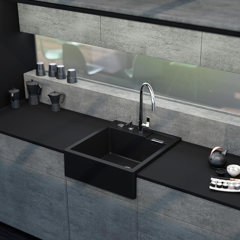 Pomivalno korito SCHOCK Kallio M-100 je mogočno in trpežno pomivalno korito. Na voljo je v tej črni barvi Night, dobavljivo pa je še v treh drugih barvah CRISTADUR® GreenLine. Gre za nasadno pomivalno korito, kar pomeni, da se vgradi kot zgornji element kuhinjske omarice namesto pulta. Korito se bo najbolj domače počutilo v rustikalnih in domačih kuhinjah, lepo pa se mu poda kuhinjska armatura SCHOCK Resi.