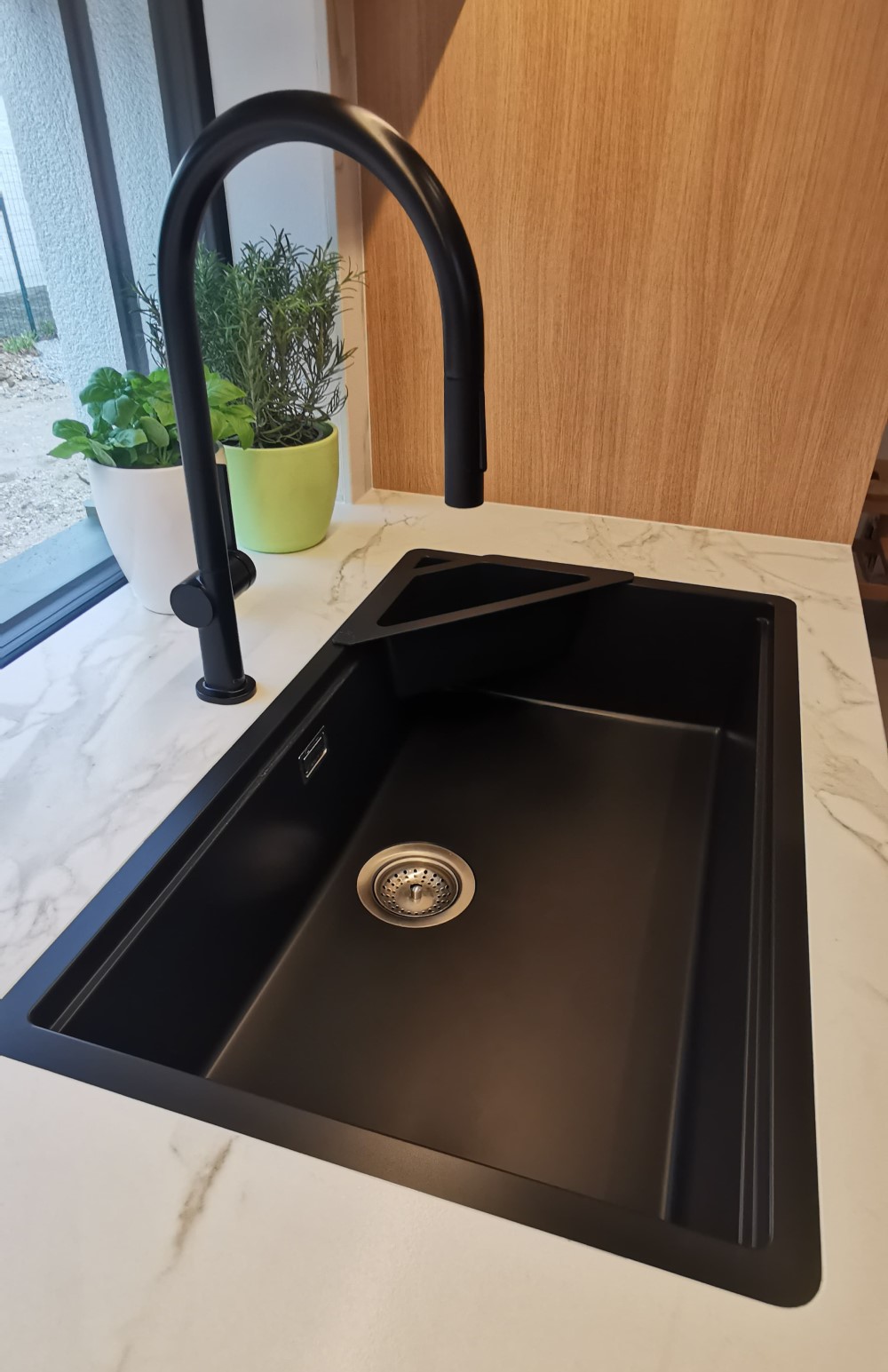 Korito prihaja iz prestižne linije Cristadur® in v tej črni barvi Night se bo lepo umestilo v vsako kuhinjo. Lahko mu dodate še druge dodatke kot so izlivno prelivna garnitura v različnih barvnih obdelavah, dva različna dizajnerska odcejalnika iz plemenitega jekla v večih barvah, dva različna silikonska odcejalnika, rezalna deska, nosilec s posodo in/ali cedilom, gumb za avtomatsko odpiranje in zapiranje izliva, praktično kotno posodico ter več različnih dozirnikov za milo.