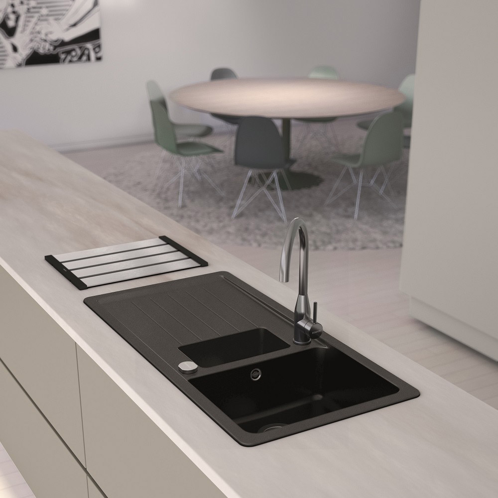 Pomivalno korito SCHOCK Toledo D-150 je novost med kamnitimi pomivalnimi koriti. Zraven te črne barve Magma ga lahko najdete še v štirih drugih barvah. Za to korito je značilna ena velika ter ena majhna posoda za odcejevanje pribora ali majhnih kuhinjskih pripomočkov. Za veliko količino oprane posode bo poskrbel velik odcejalnik. Korito je odporno na praske in udarce, za kar poskrbi kakovosten material prestižne linije Cristadur®.