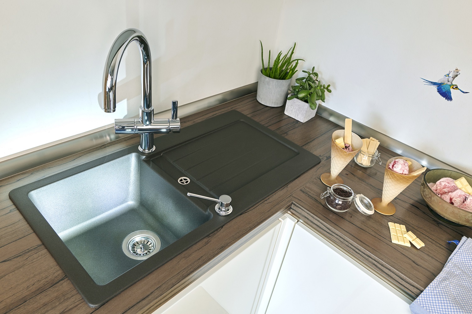 Temu koritu lahko dodate razne dodatke kot so LED razsvetljava, rezalna deska iz lesa ali umetnih vlaken, žična košara, praktična kotna posodica, dekorativni pokrov izliva ali kakšen dozirnik. Prav tako pa lahko za vsa korita Schock iz naše ponudbe dobite tudi vsa potrebna sredstva za nego in čiščenje.