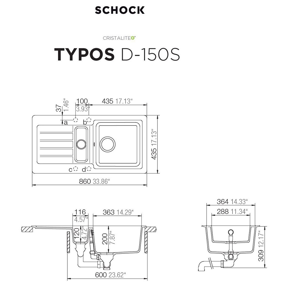 Korito se lahko namesti na vsadni (TYPD150SA) ali podvgradni (TYPD150SU + doplačilo za pritrdilni komplet) način.