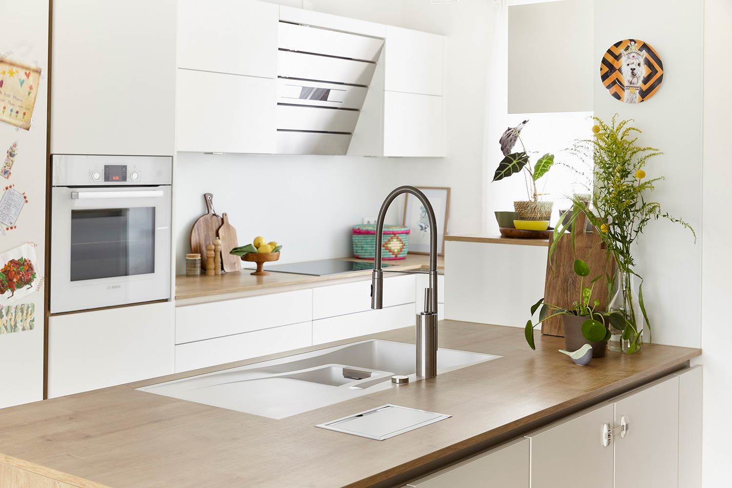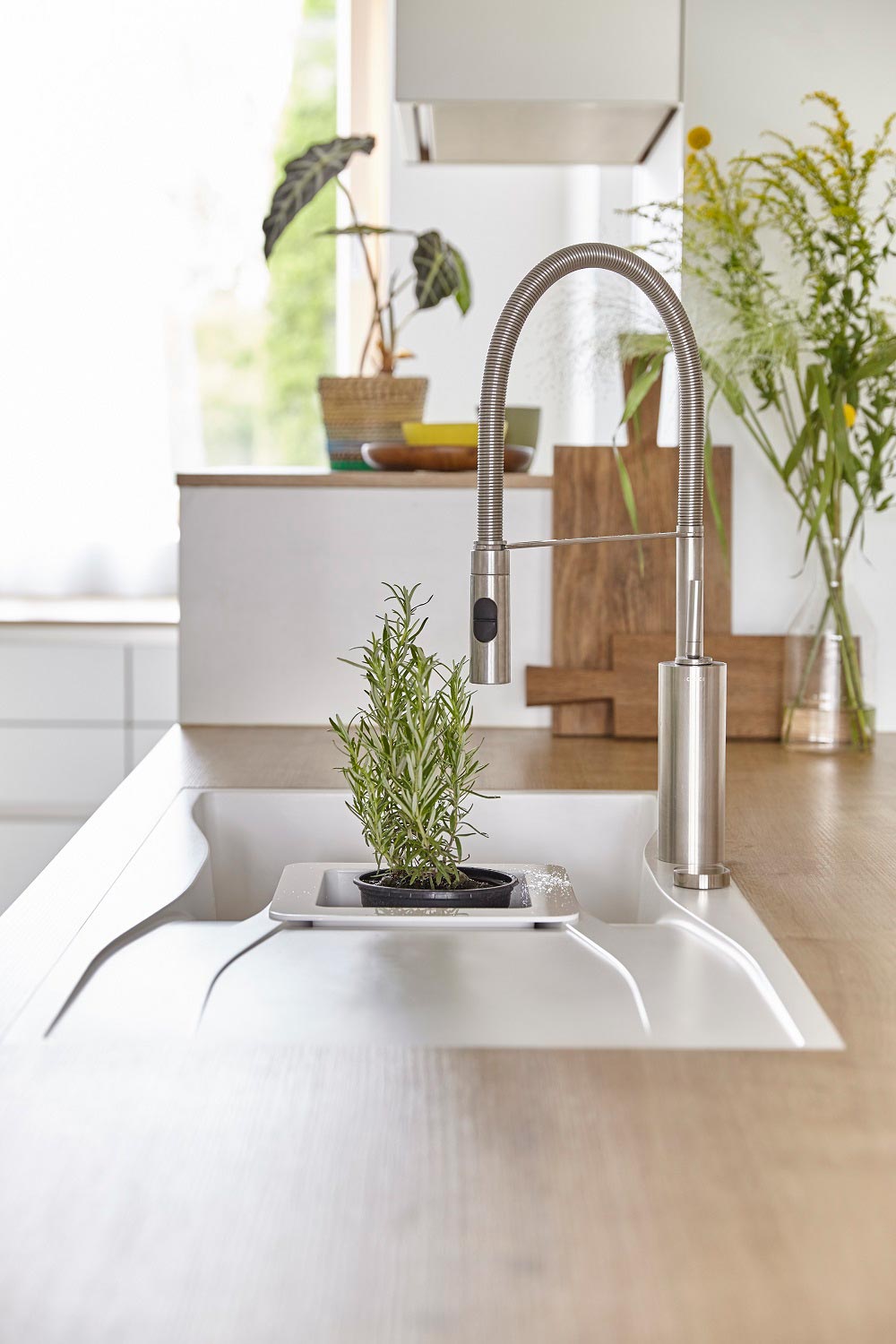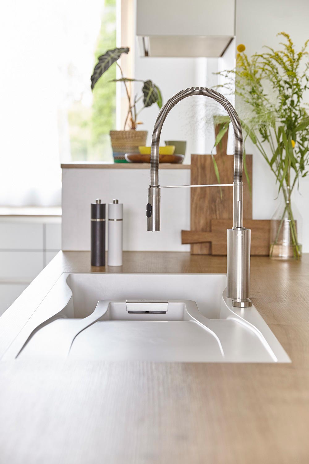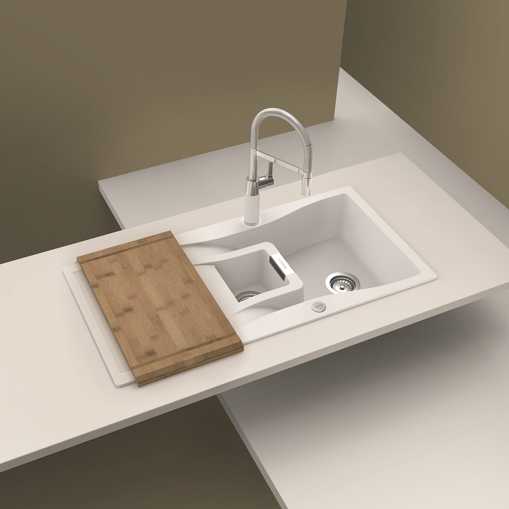Zaradi svojih dimenzij je primeren za večje kuhinje, lahko se ga pa vgradi na različne načine, glede na potrebe vaše kuhinje. Za korito nudimo tudi različne dodatke kot so LED luči, izlivno prelivna garnitura v različnih barvnih obdelavah, lesena rezalna deska ali iz umetnih vlaken, dizajnerski odcejalnik iz plemenitega jekla v različnih barvah, gumb za avtomatsko odpiranje in zapiranje izliva, dekorativni pokrov izliva ter različni dozirniki za milo.