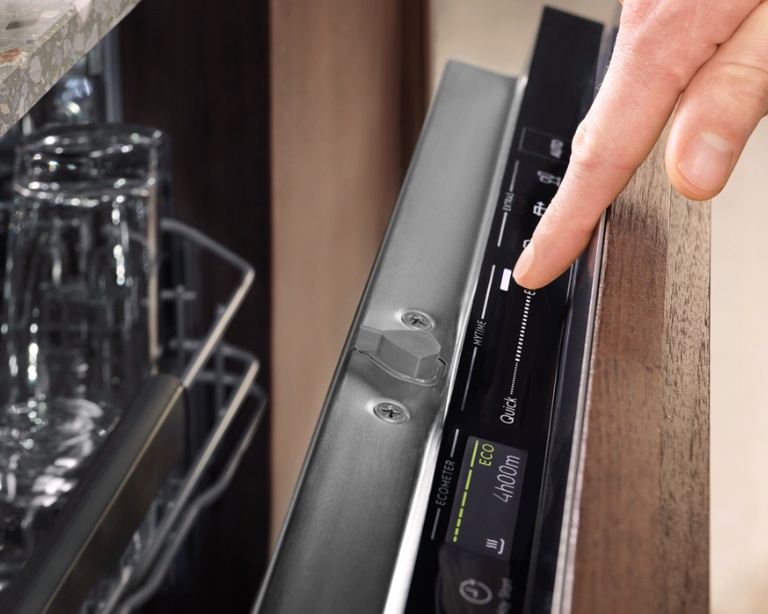 Vgradni pomivalni stroj Electrolux EEQ47210L zagotavlja prilagojene rezultate pomivanja z upravljalnikom na dotik QuickSelect. Z drsnikom izberete program in čas trajanja, ostalo pa stroj opravi sam. Na voljo je 8 programov s 3 različnimi temperaturami. Stanje pomivalnega stroja vam sporoča pika na tleh, ki projicira rdečo svetlobo, ko stroj pomiva, in zeleno, ko je pomivanje končano. Stroj je tudi zelo tih. Glasnost pomivanja je namreč zgolj 44 dB.