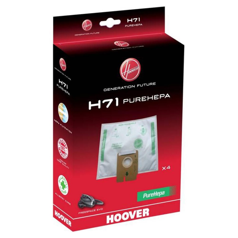 Sintetične vrečke za sesalec Hoover H71 PureHepa s HEPA filtriranjem prahu in mikro delcev proti alergijam. Vrečka zagotavlja prepričljive rezultate za veliko daljše časovno obdobje. Za optimalno delovanje sesalnika priporočamo, da vrečke redno menjate. V paketu so 4 vrečke.